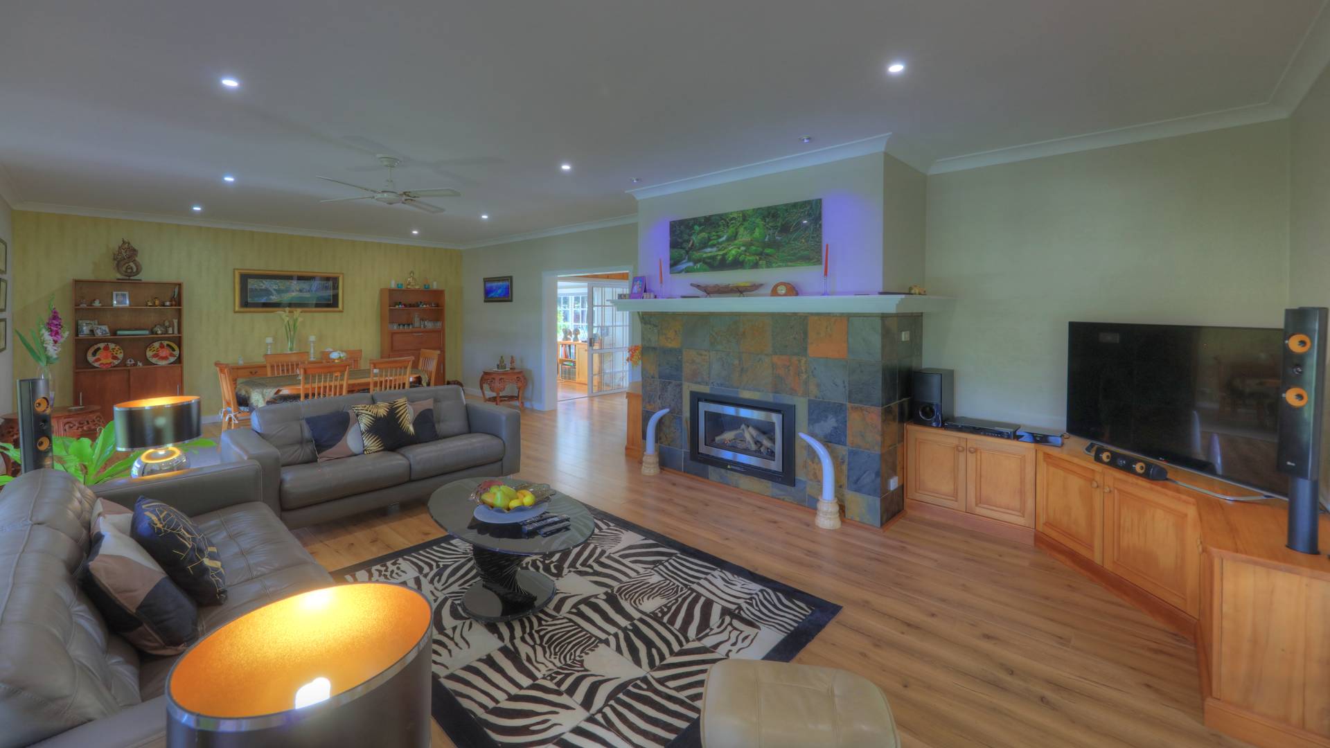 - The stylish open plan dining and living area has a grand slate feature fireplace with built-in, remote controlled gas fire.