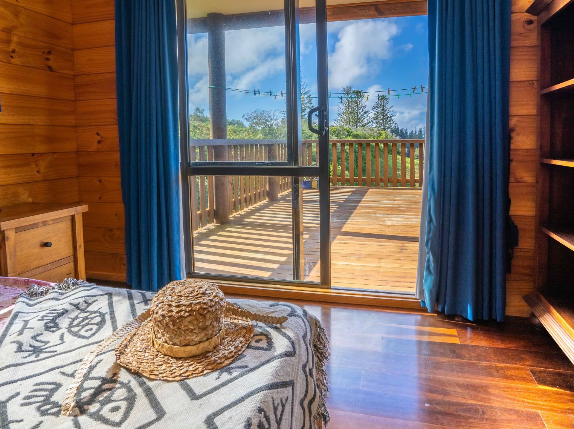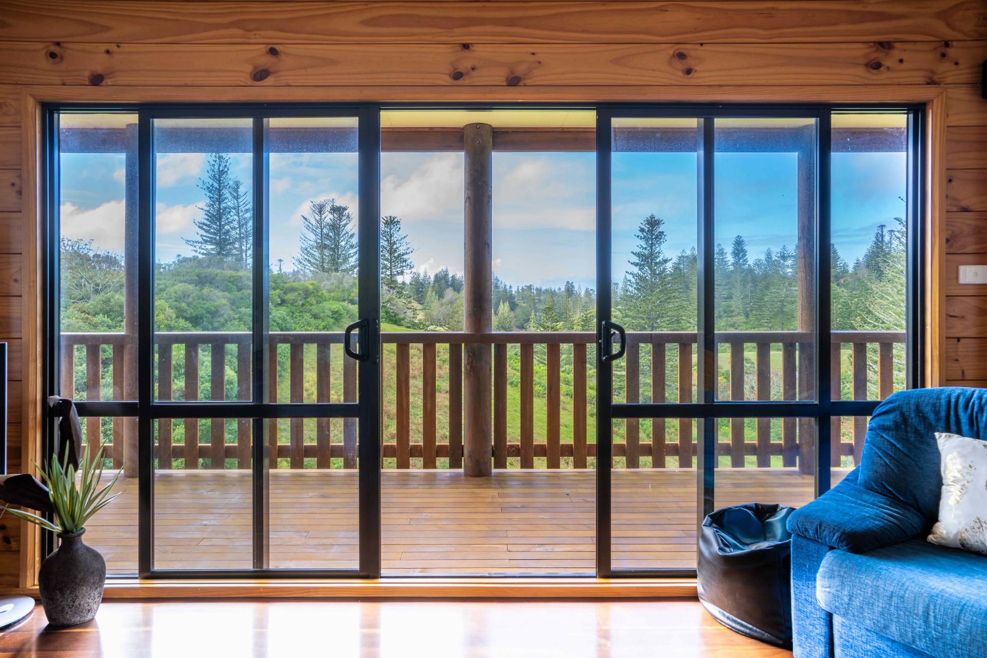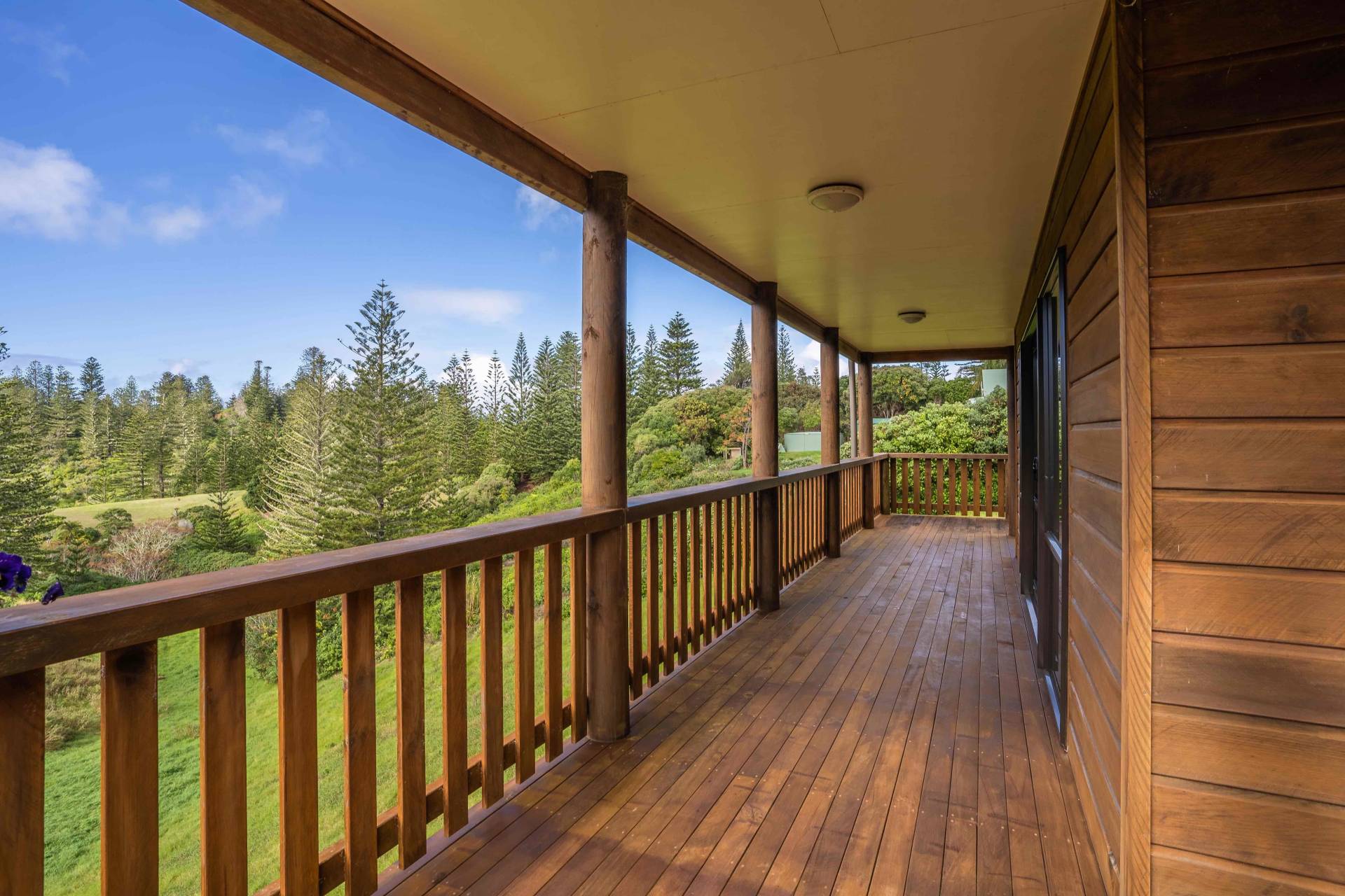 A spacious kitchen with modern appliances, stainless steel bench-tops and a huge island bench is the heart of a large dining and lounge room area. Throughout the home you will find polished hardwood flooring and above average height ceilings – the house is perfectly built for Norfolk Island, with wide verandahs and ranch sliding doors allowing sea breezes in during summer  whilst the internal timber walls create a cosy feel in our mild winters.