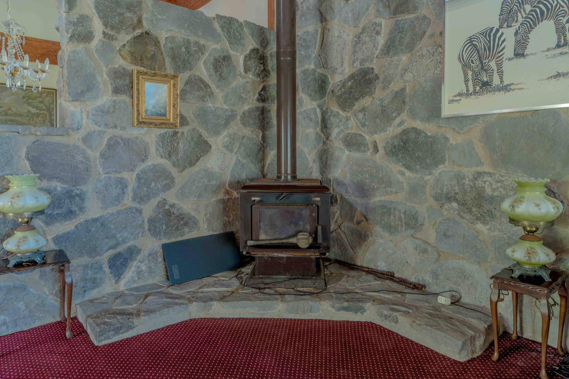 ~ Huge living room with basalt stone feature wall behind wood burning fireplace