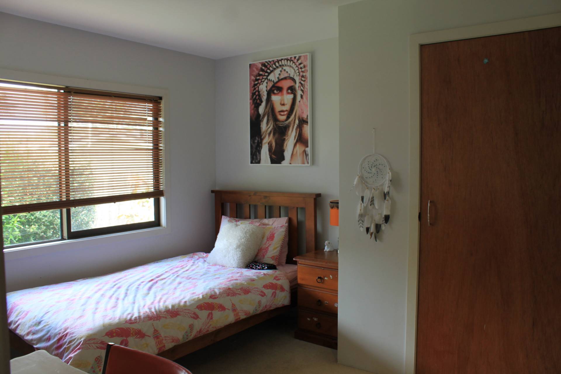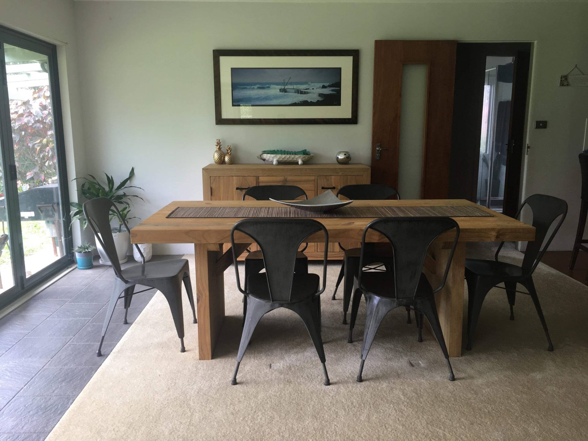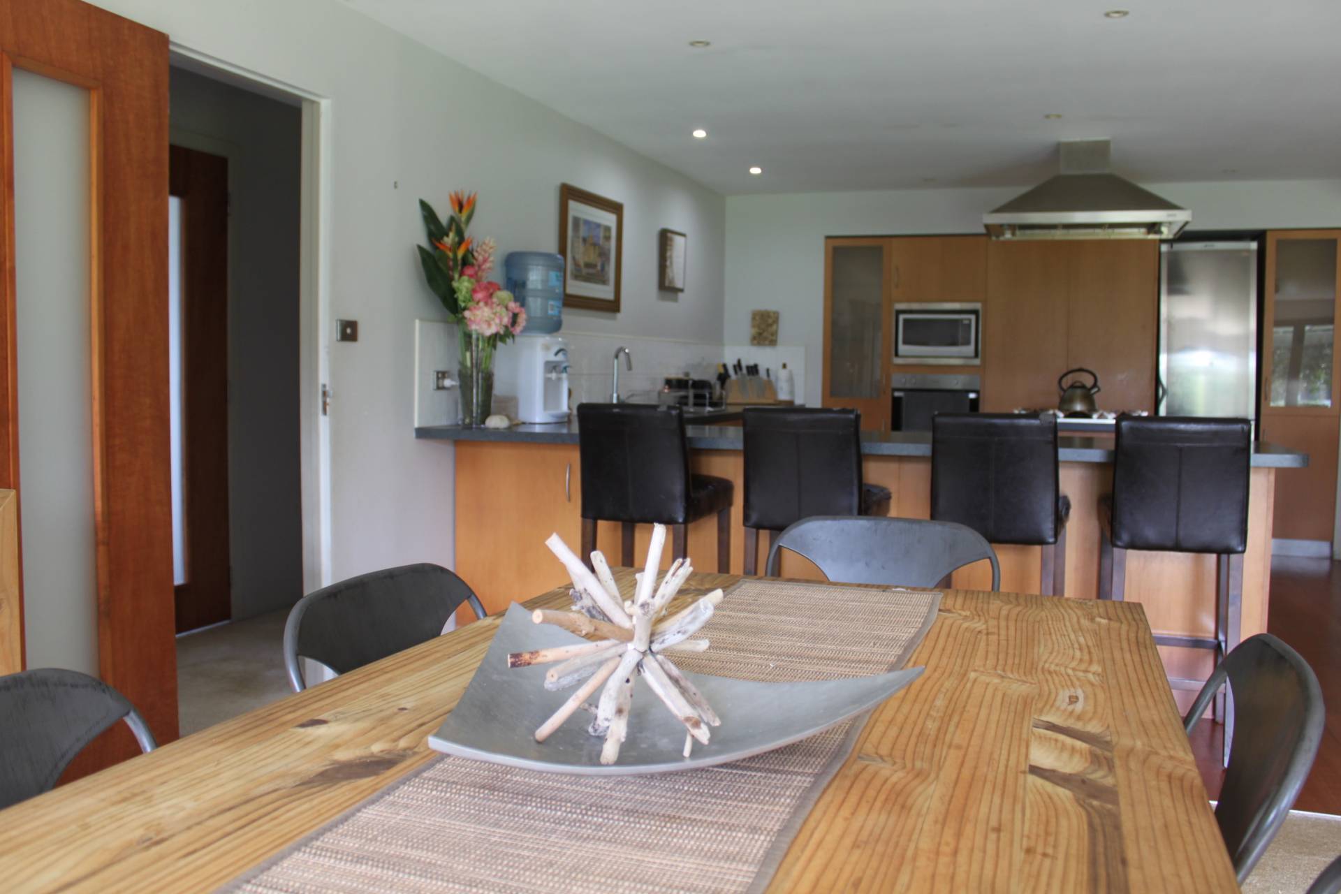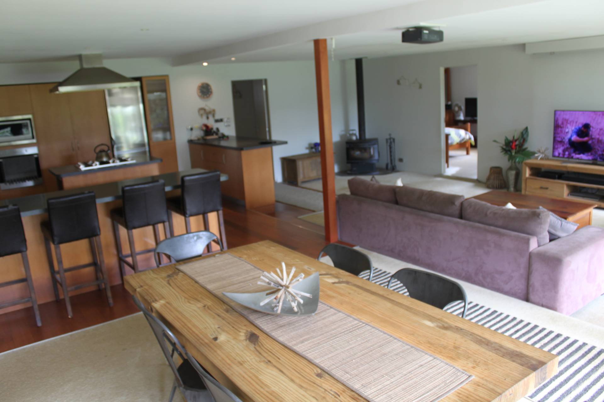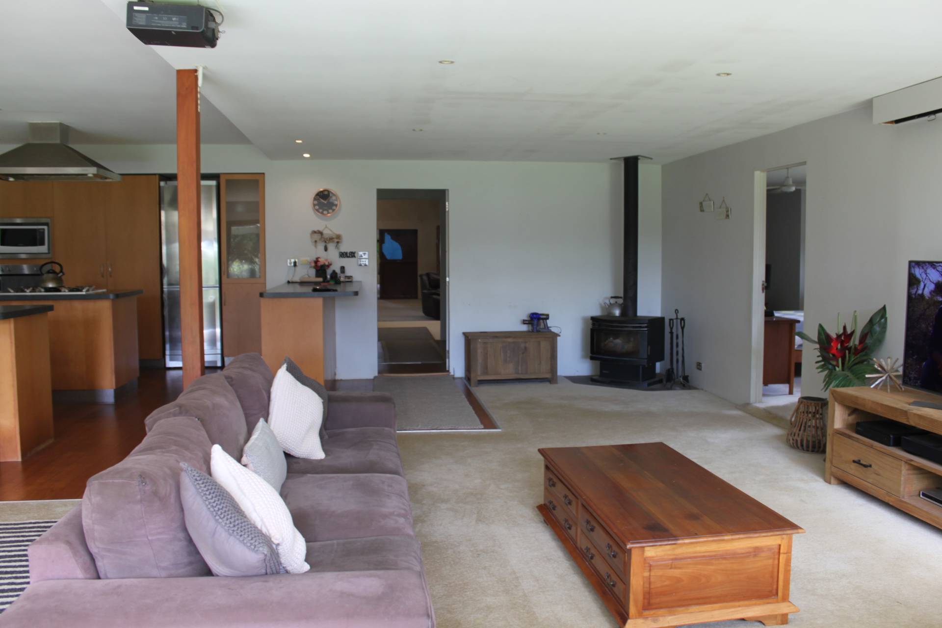Large glass sliding doors off the dining area open the home up to outside and the extensive property beyond. There is over 1.5ha of land, including a waterfall, established fruit trees, vegetables gardens and wide open spaces. The fruit trees provide enough crop to be able to sell – the current owners have created a neat little road side stall for the overflow!