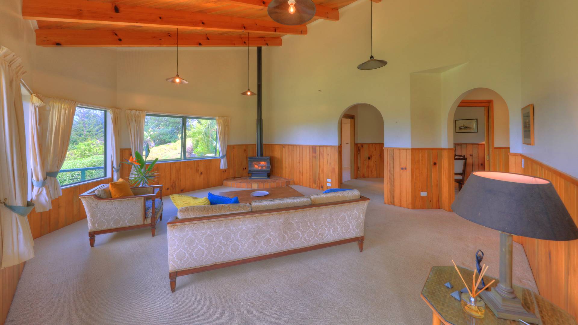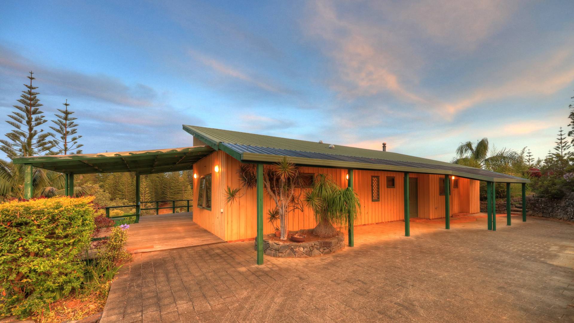 The exterior cladding is of board and baton - a quality cladding used widely on the island. Outside there is extensive paving, landscaping and decking. On over a hectare of land, there are large sheds  or workshops – perfect for any hobbies, boats, multiple cars. With work these sheds could also be converted to a second dwelling with ocean views.  The large flat portion as you enter the property would be ideal for vegetable gardens,  crops or pasture for livestock and horses.