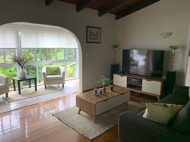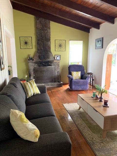 A fully renovated kitchen and dining room flow into the cosy living room.