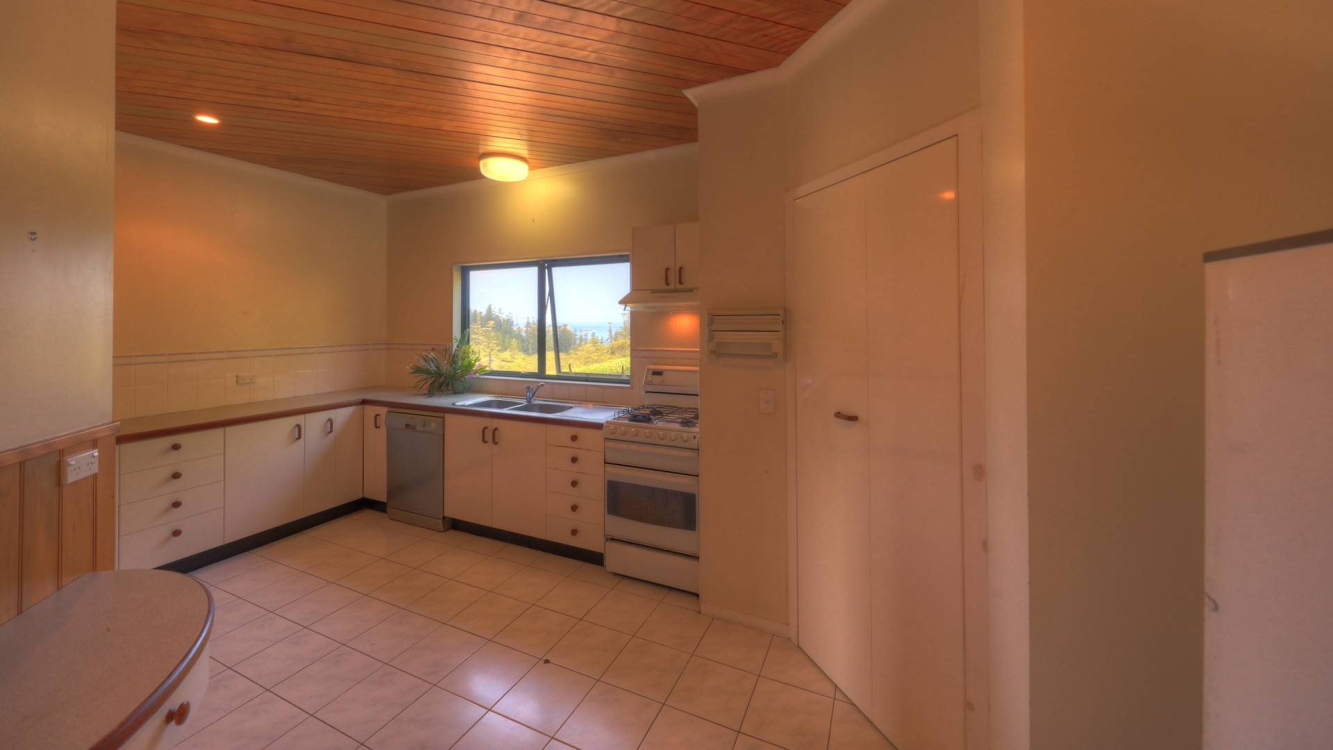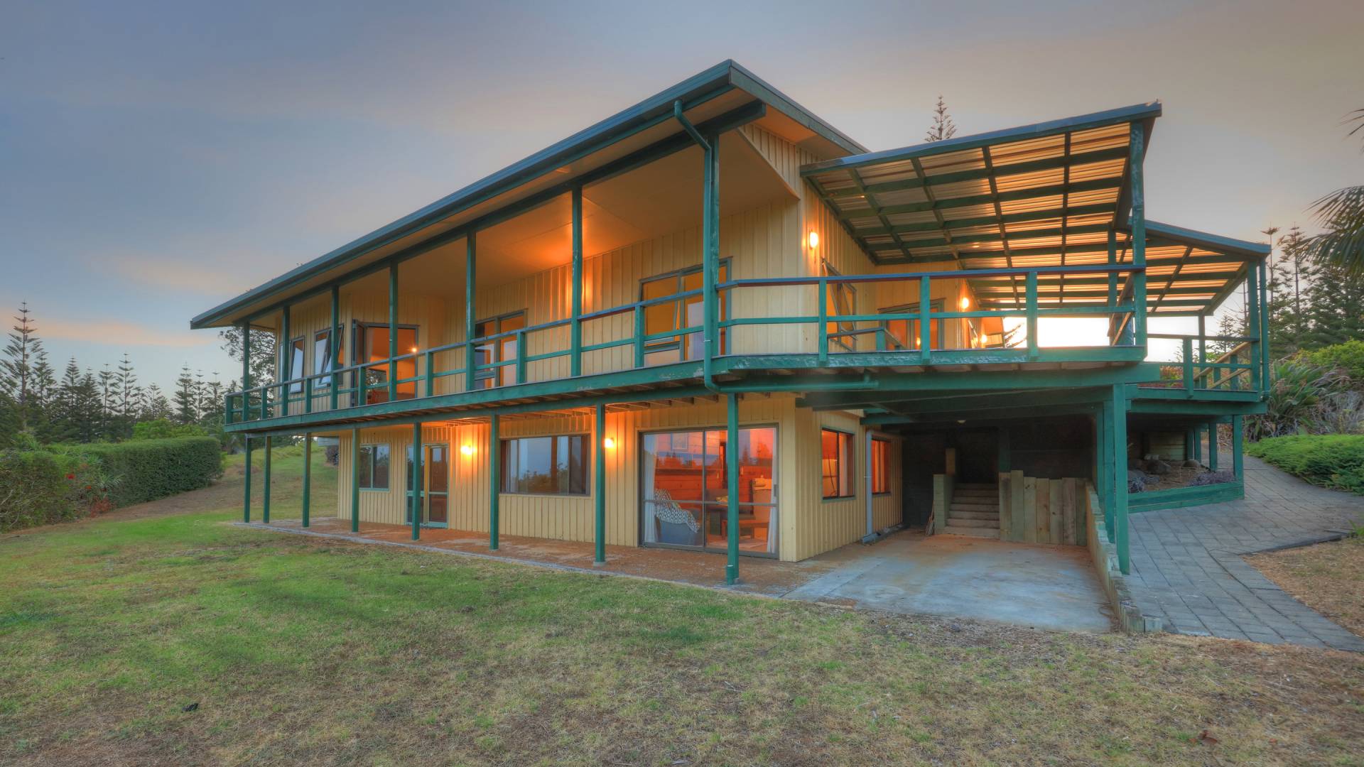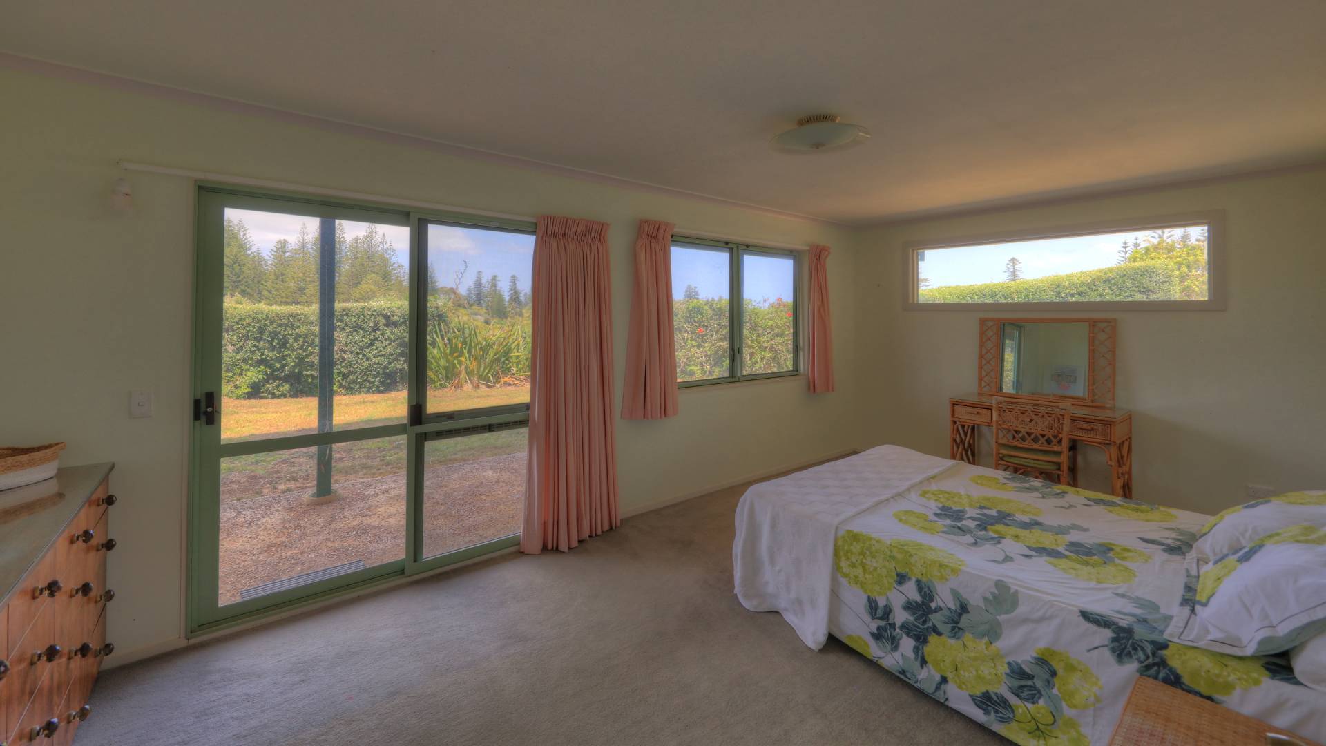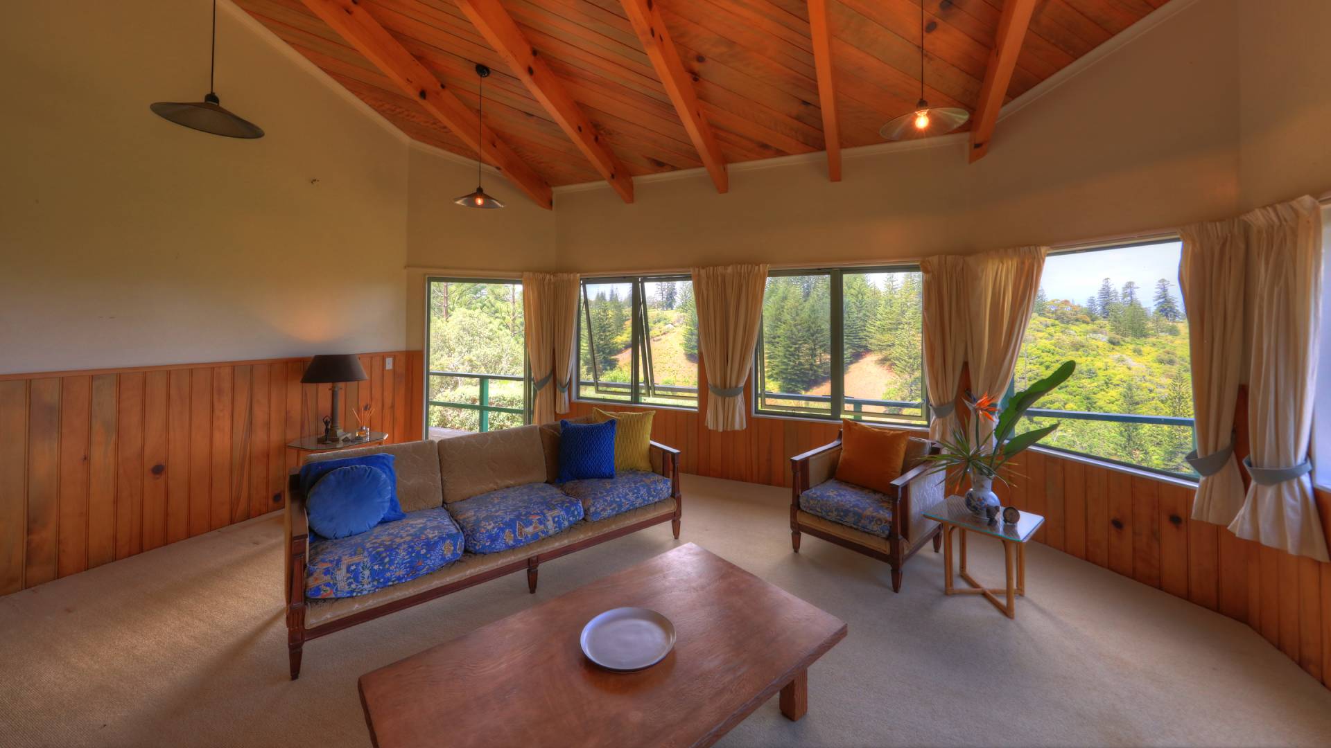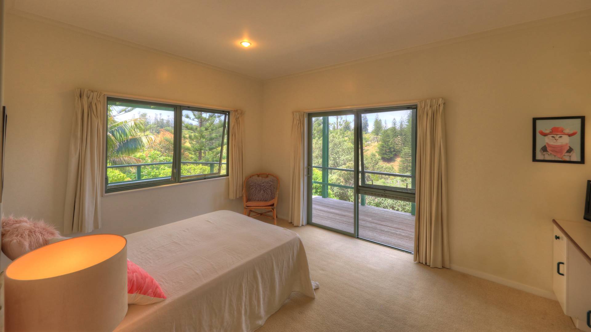 The home features a main living area which is spacious and bright with large windows. High ceilings allow the natural light to filter beautifully and bifold doors lead to a verandah overlooking valleys, out to Nepean Island. A wood burning fireplace sits neatly in the corner of the lounge room, providing warmth and comfort even in Norfolk Islands’ mild winters.