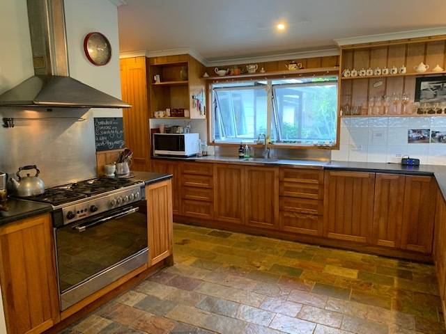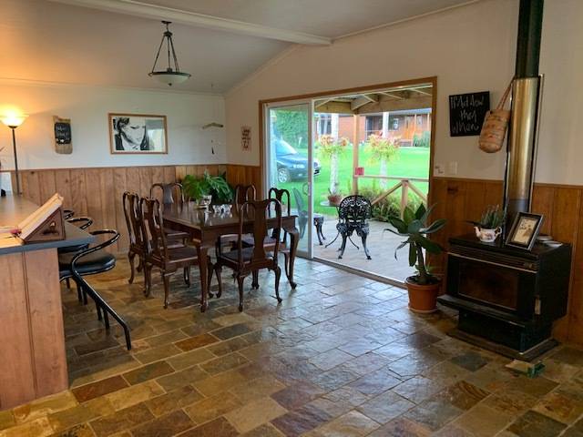 Large open plan kitchen , living and dining room with slate floors and wood fireplace.