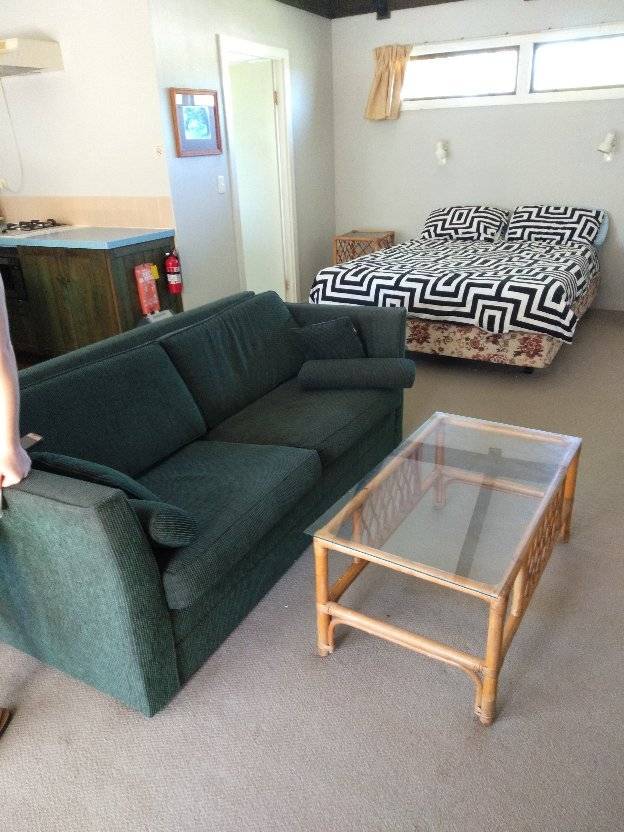 Kitchenette, dining table, couch and large king bed.