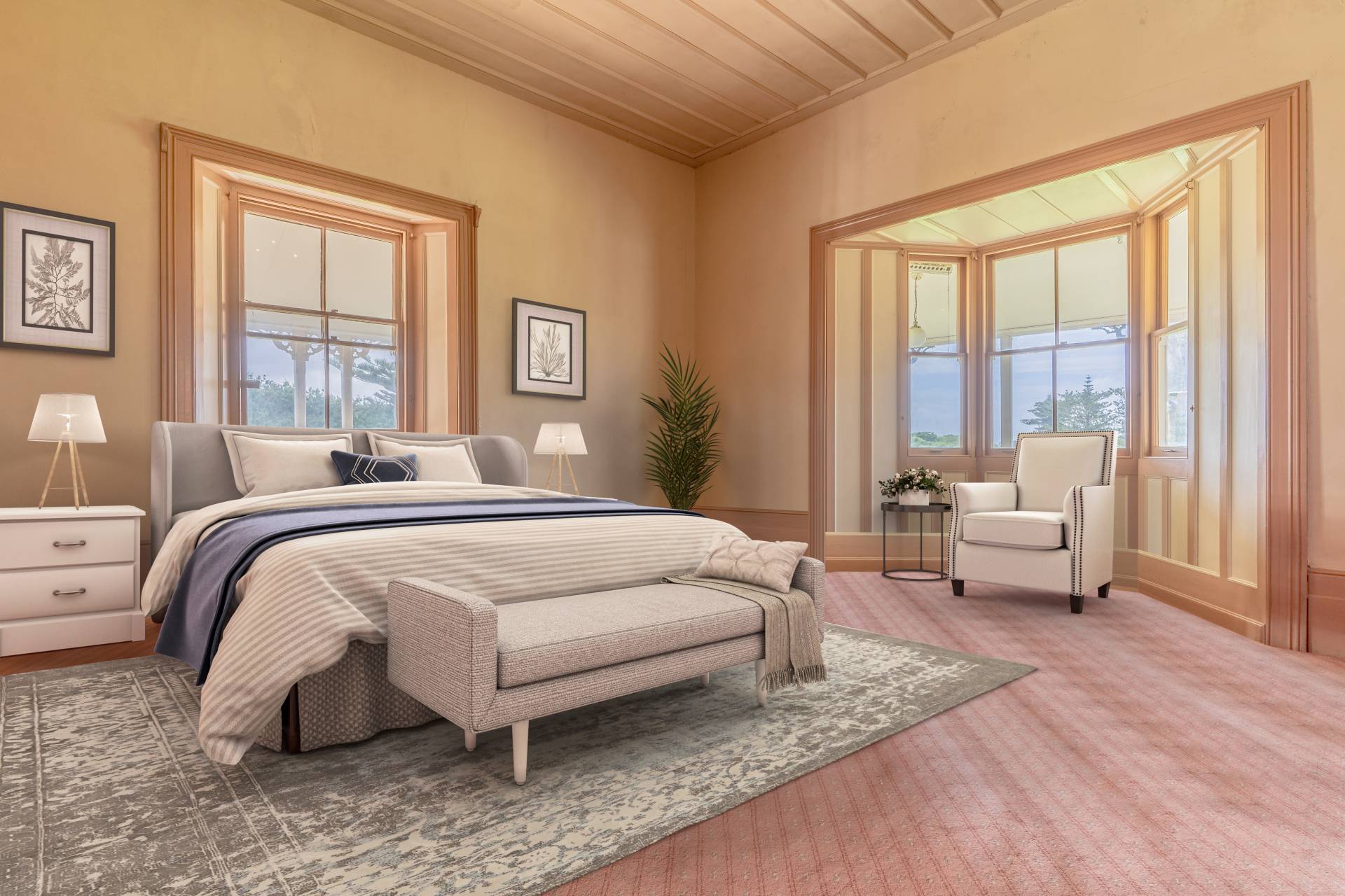 ~ 2 large bedrooms with french doors and bay windows opening out to wide stone verandahs