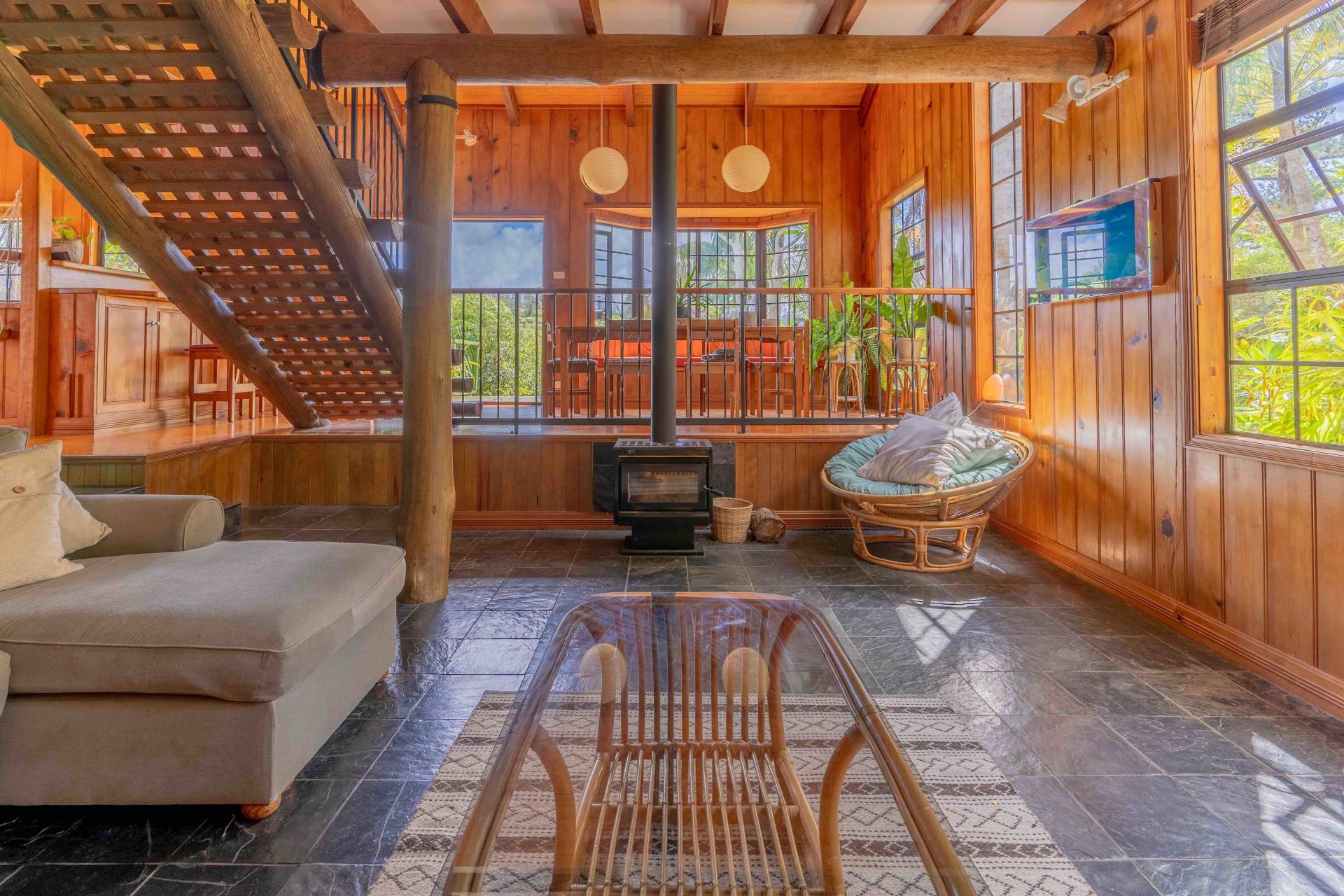 • A slate floored living room enjoys a wood-burning fireplace, perfect to keep you extra cosy during our mild winters