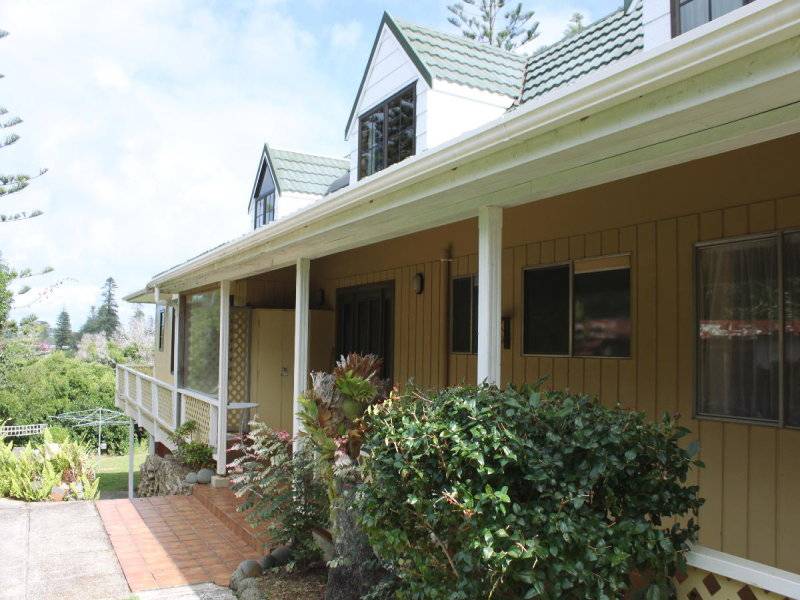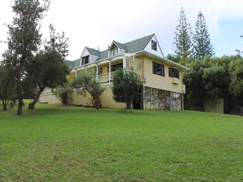 Large 2 storey family home. 5 bedroom, 2 bathrooms plus extra toilet. Spacious lounge/dining with fireplace and features Norfolk pine timber throughout house. Kitchen with distant sea views. Main bathroom with spa. Verandahs on 2 sides. Plenty of storage space and sheds. Valley views. Lovely mature gardens with fruit trees and creek boundary. Room to graze stock. 10,000 gals water storage.