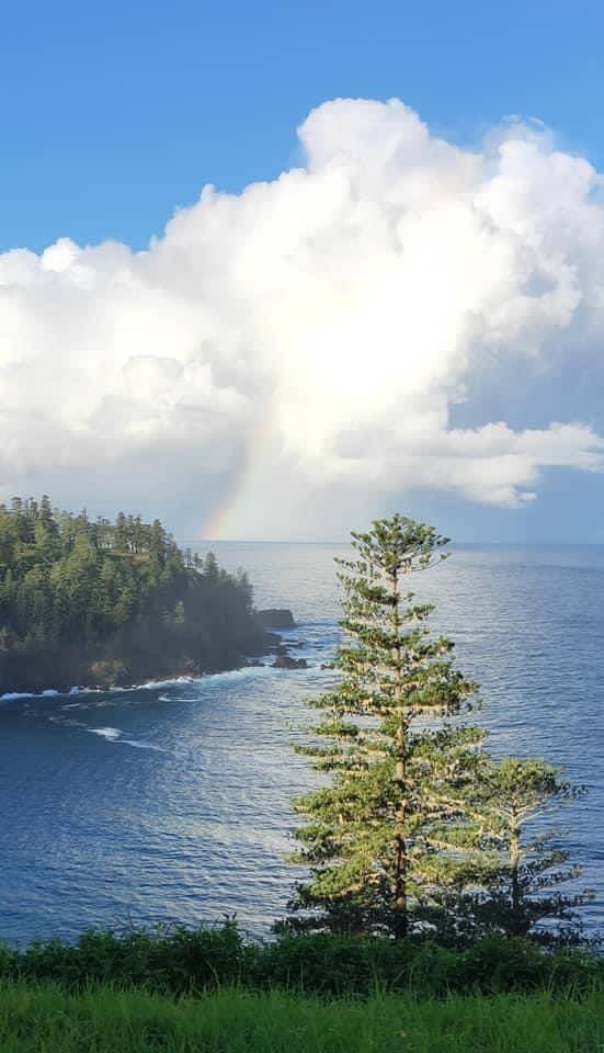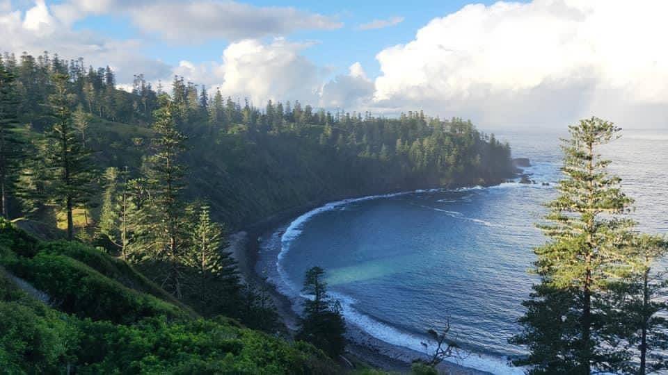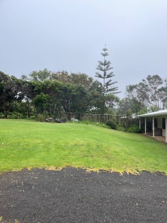 Flat land around property, sloping away to the view.  Very private and a short drive to town, beach and school.