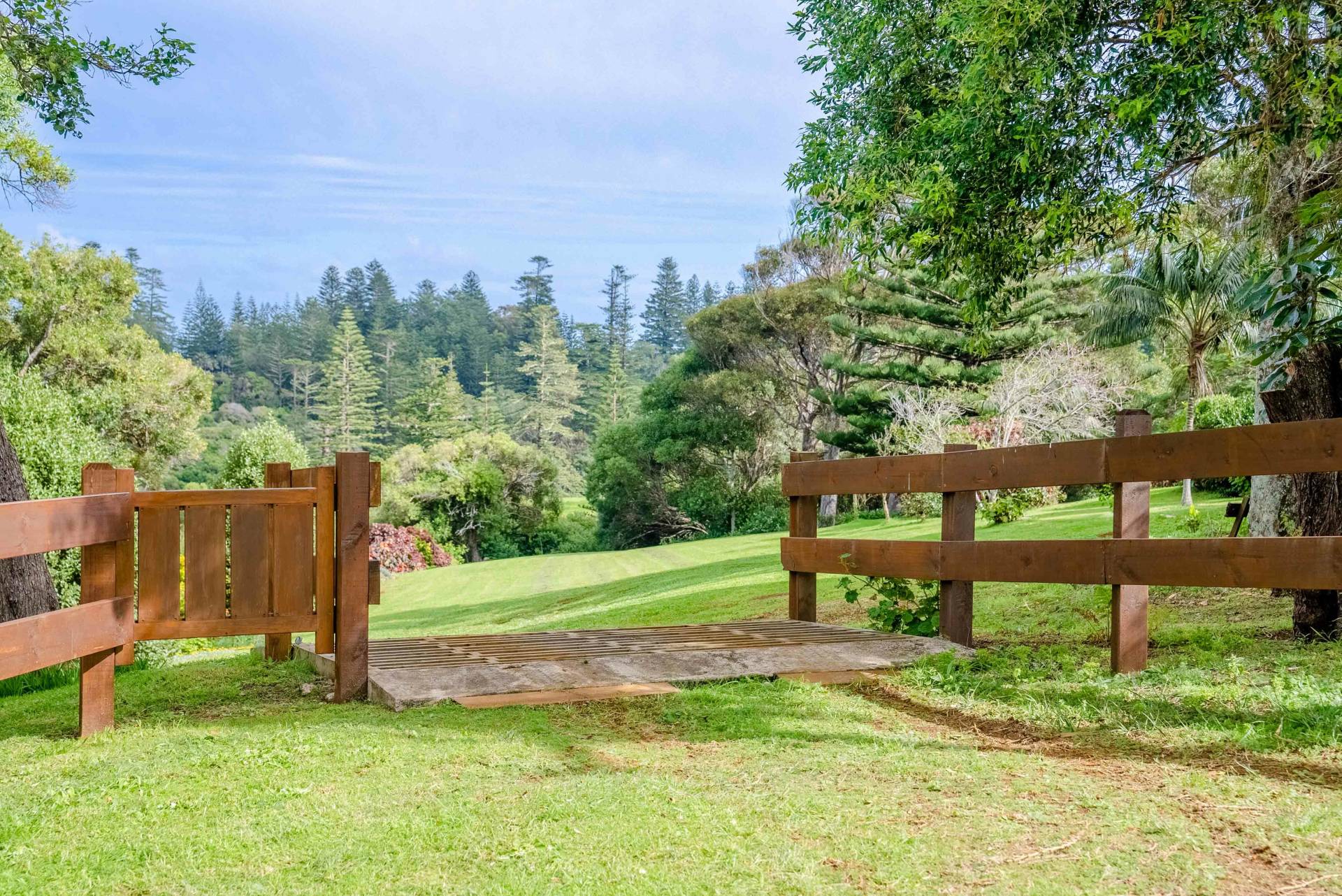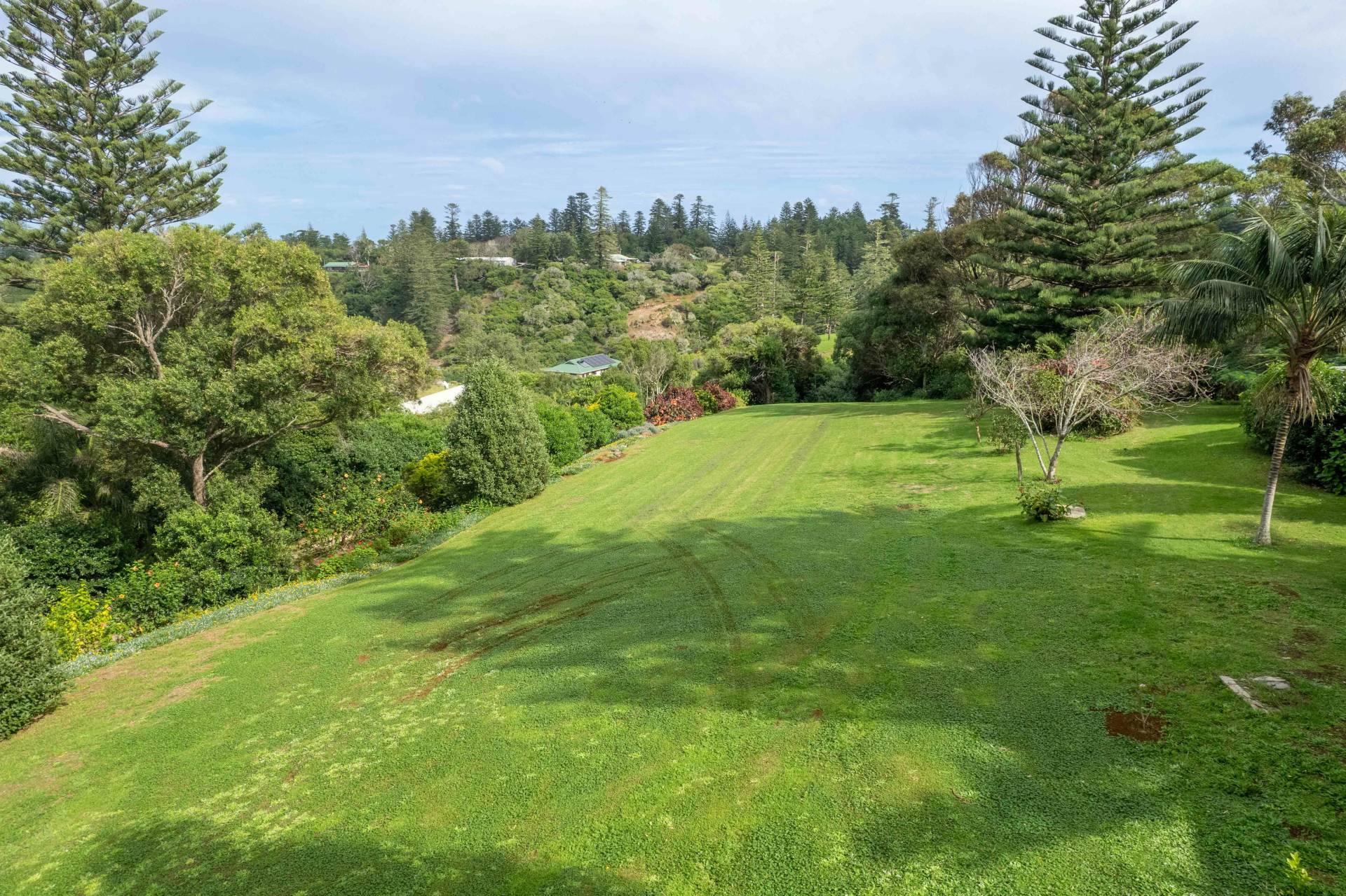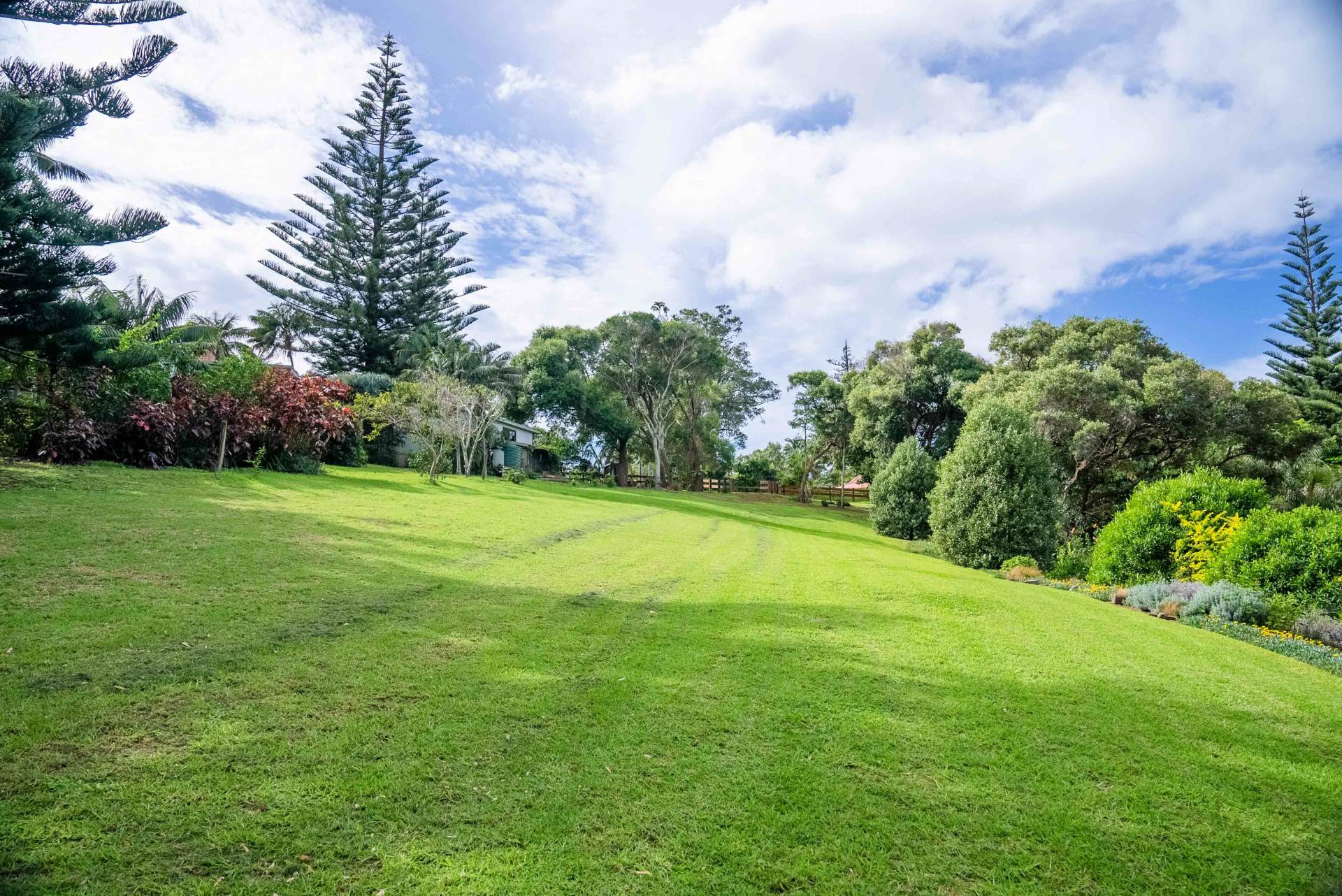 The road frontage has recently been fenced with stained timber and a cattle stop installed. From here the land slopes very gently across mown grass towards an established garden of flowers, shrubs and native trees.