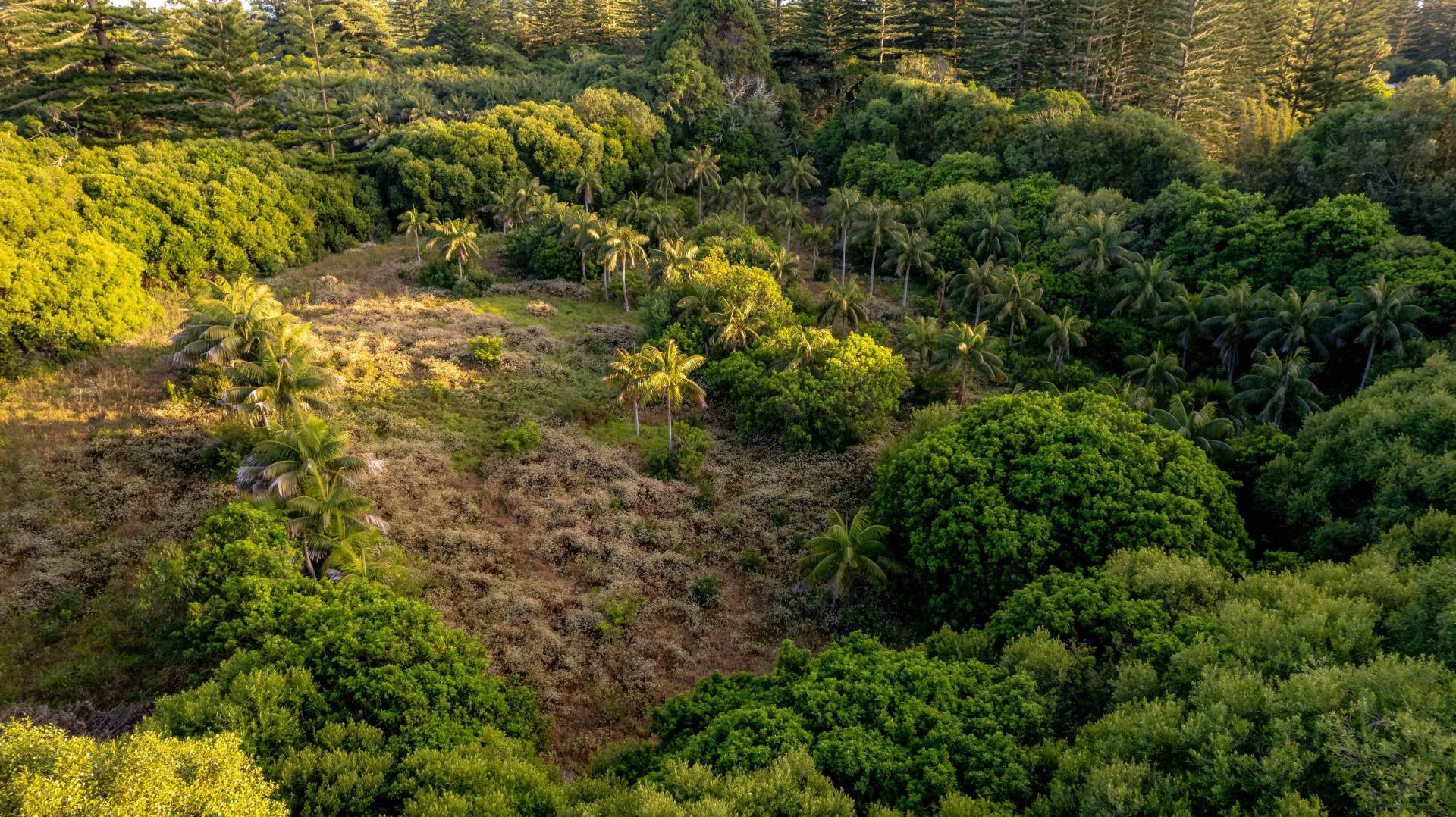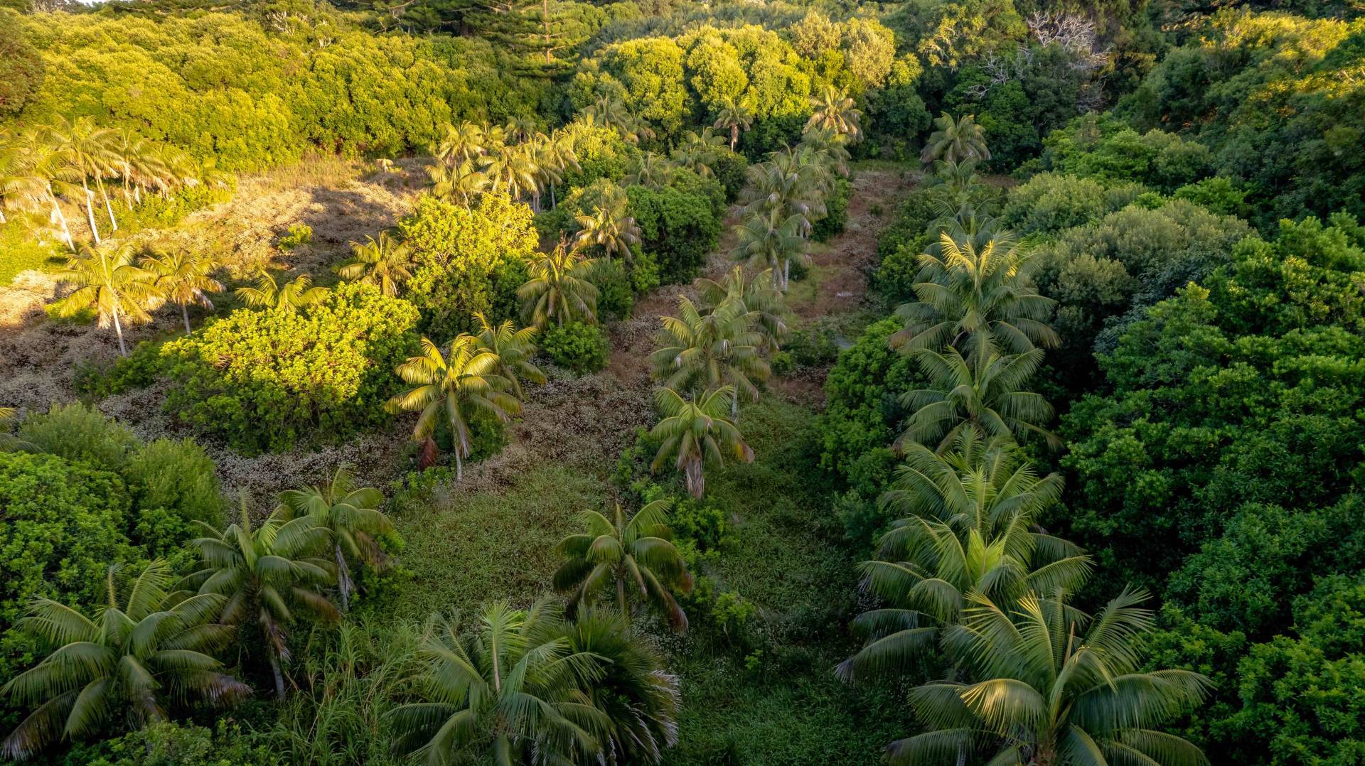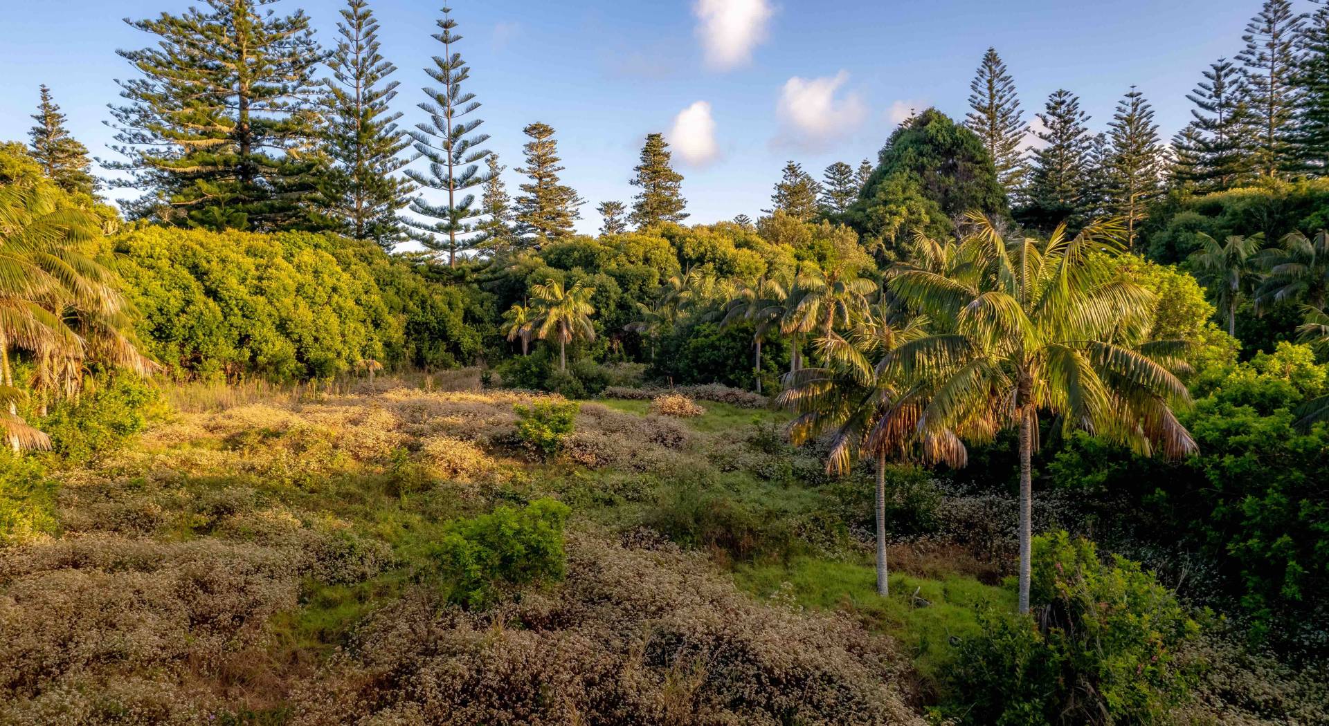 The block has been cleared in parts and the boundary is heavily laden with established trees, plus a collection of Kentia palm trees beautifully placed in the centre of the block.