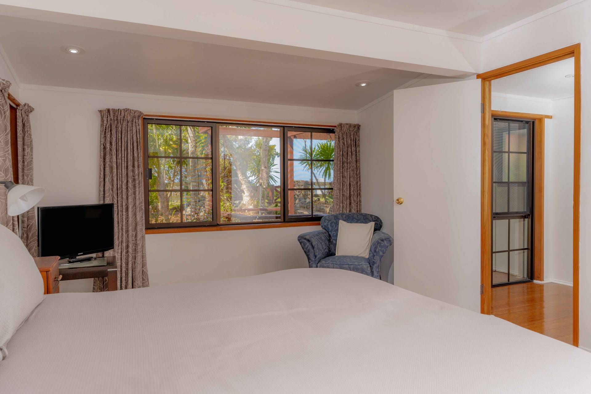 The upper-level with ocean views houses four king-sized bedrooms - each with their own ensuite and television, providing privacy and functionality.