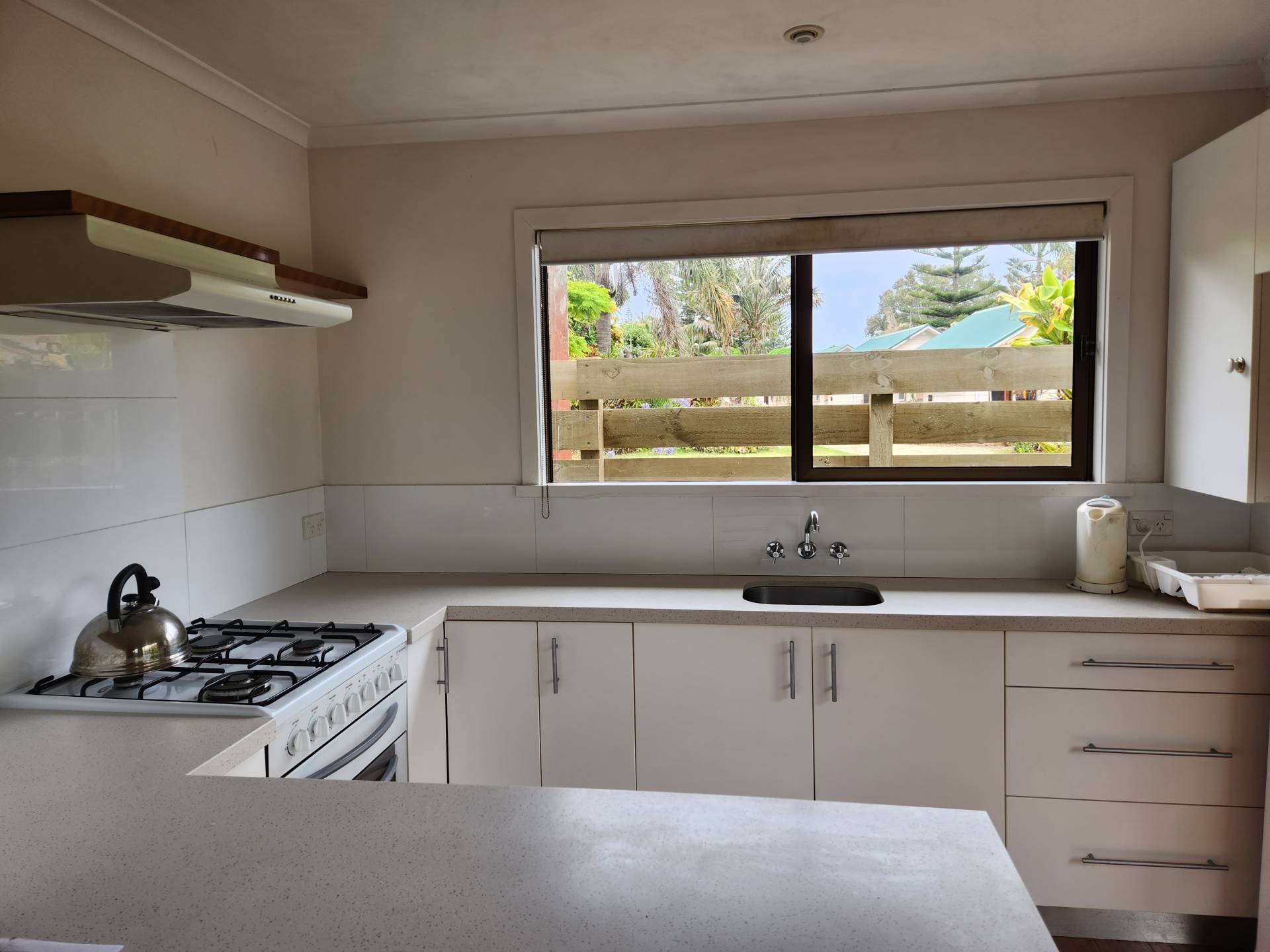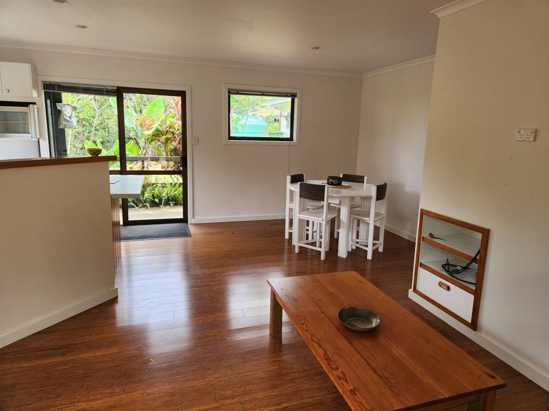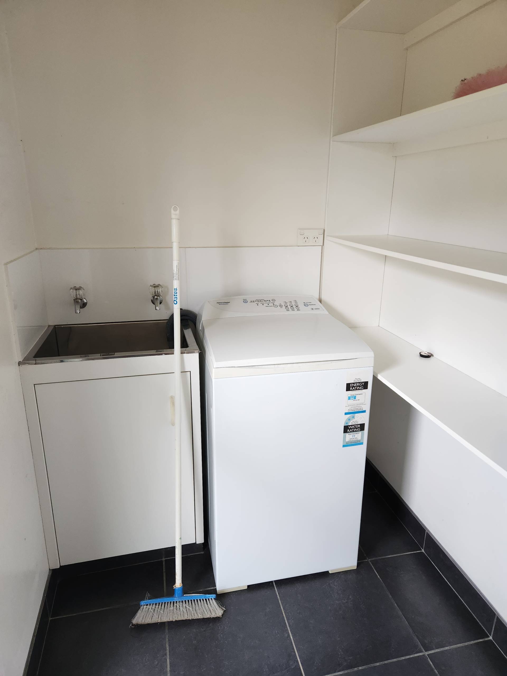 Open plan living/dining/kitchen area, separate bedroom, and storage facilities including built-in robes and linen cupboard. The back door from laundry opens onto a courtyard style clothesline.