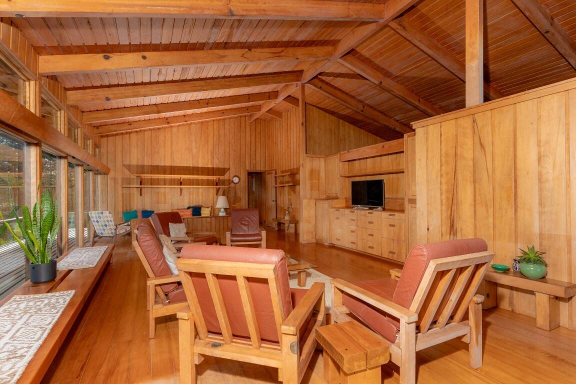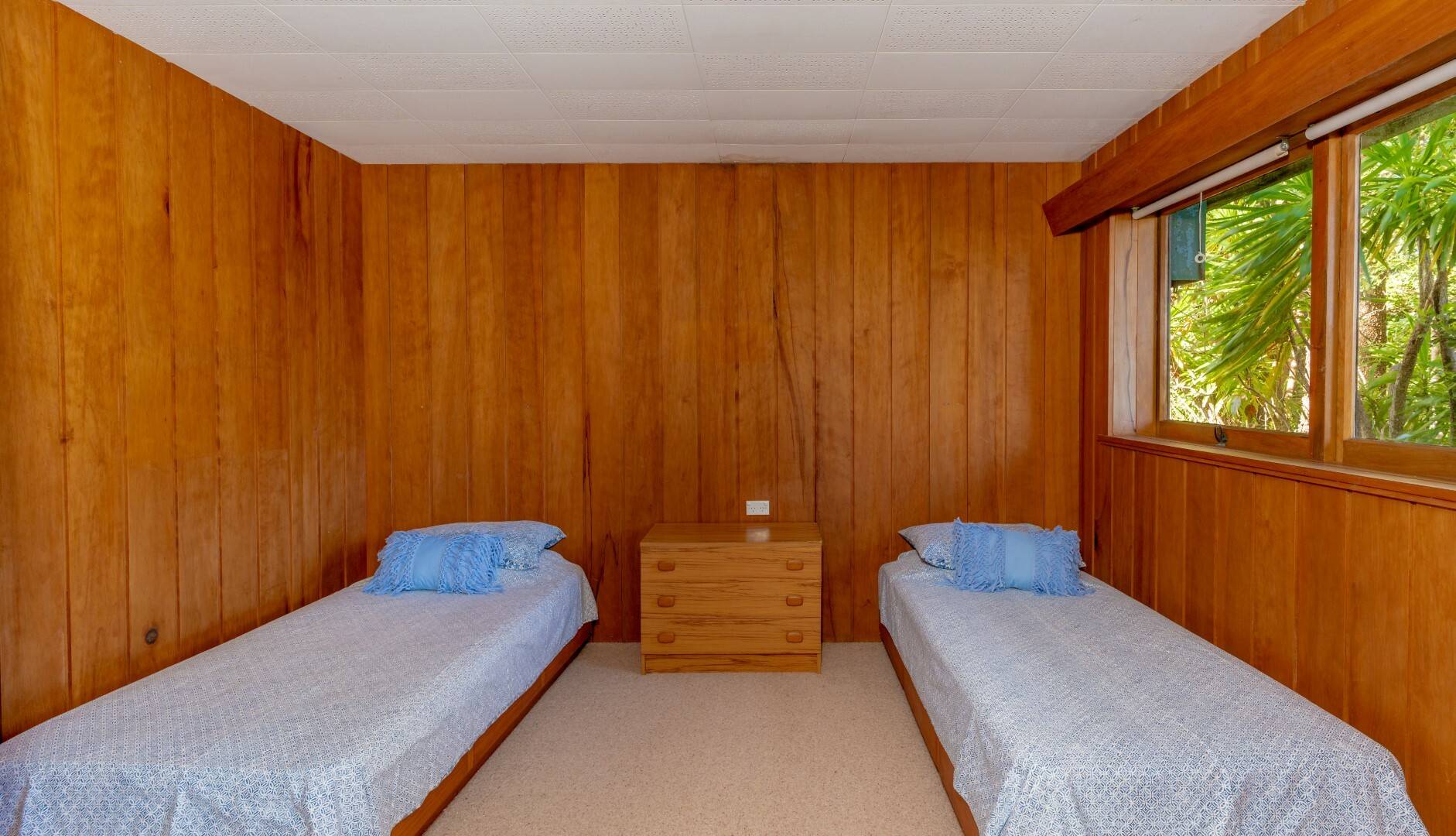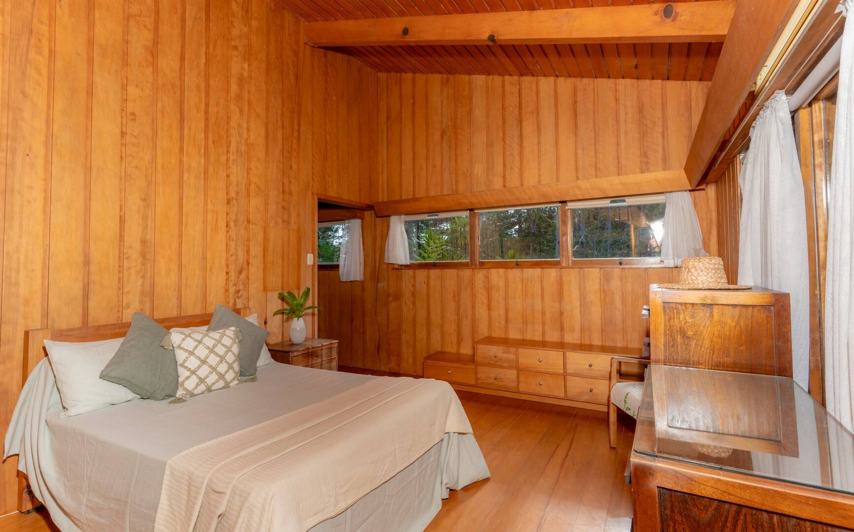 Upstairs, the house is predominantly timber, with pine walls and floors and raked ceiling throughout, providing a natural earthy vibe. The enormous living room captures the breathtaking views through the floor-to-ceiling glass walls. The formal dining room could be converted to an extra bedroom or office with a few alterations. The master bedroom with ensuite bathroom and walk in robe is spacious and bright.