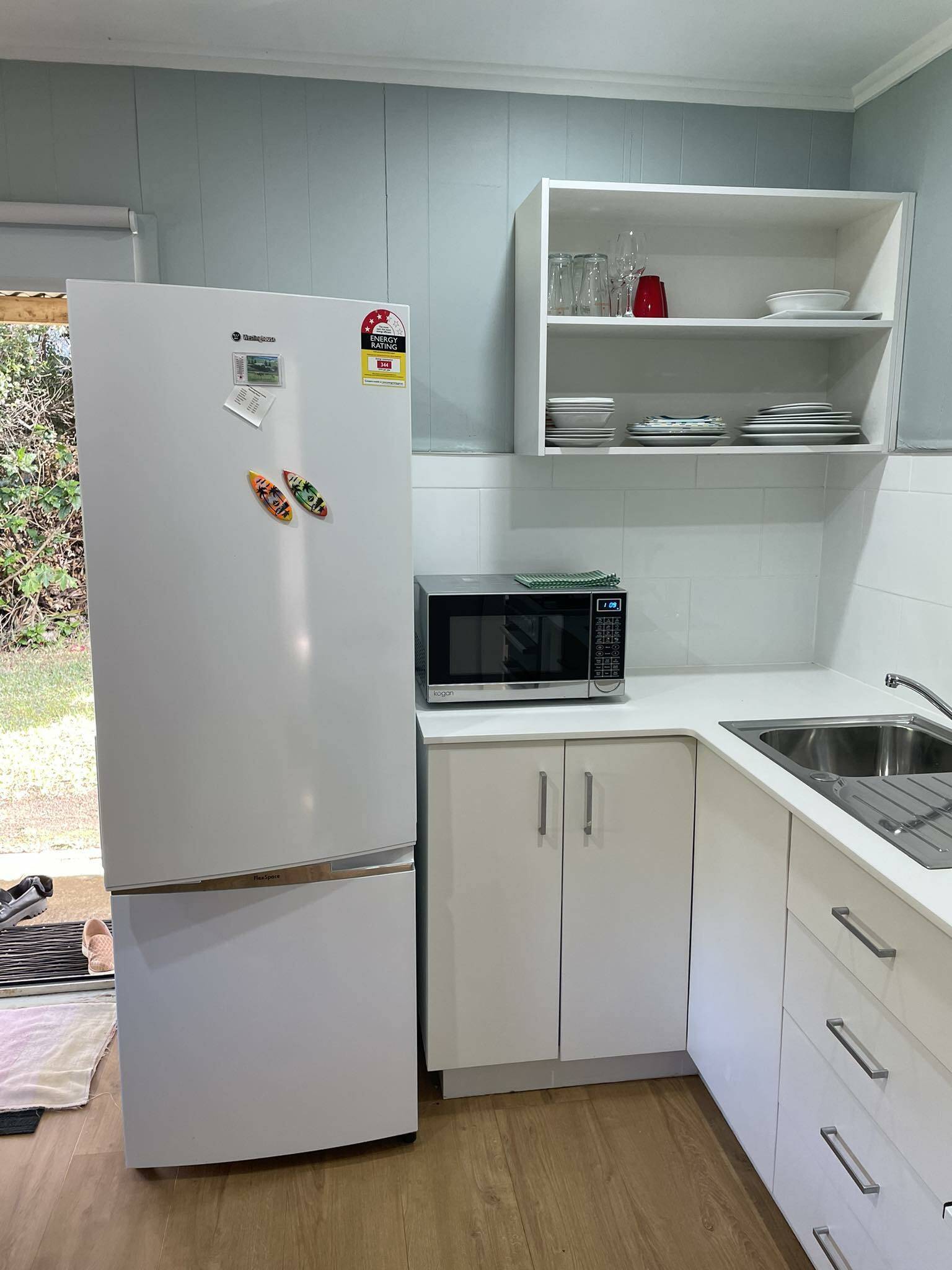The spacious kitchen boasts modern amenities such as a large fridge, microwave and new stove.