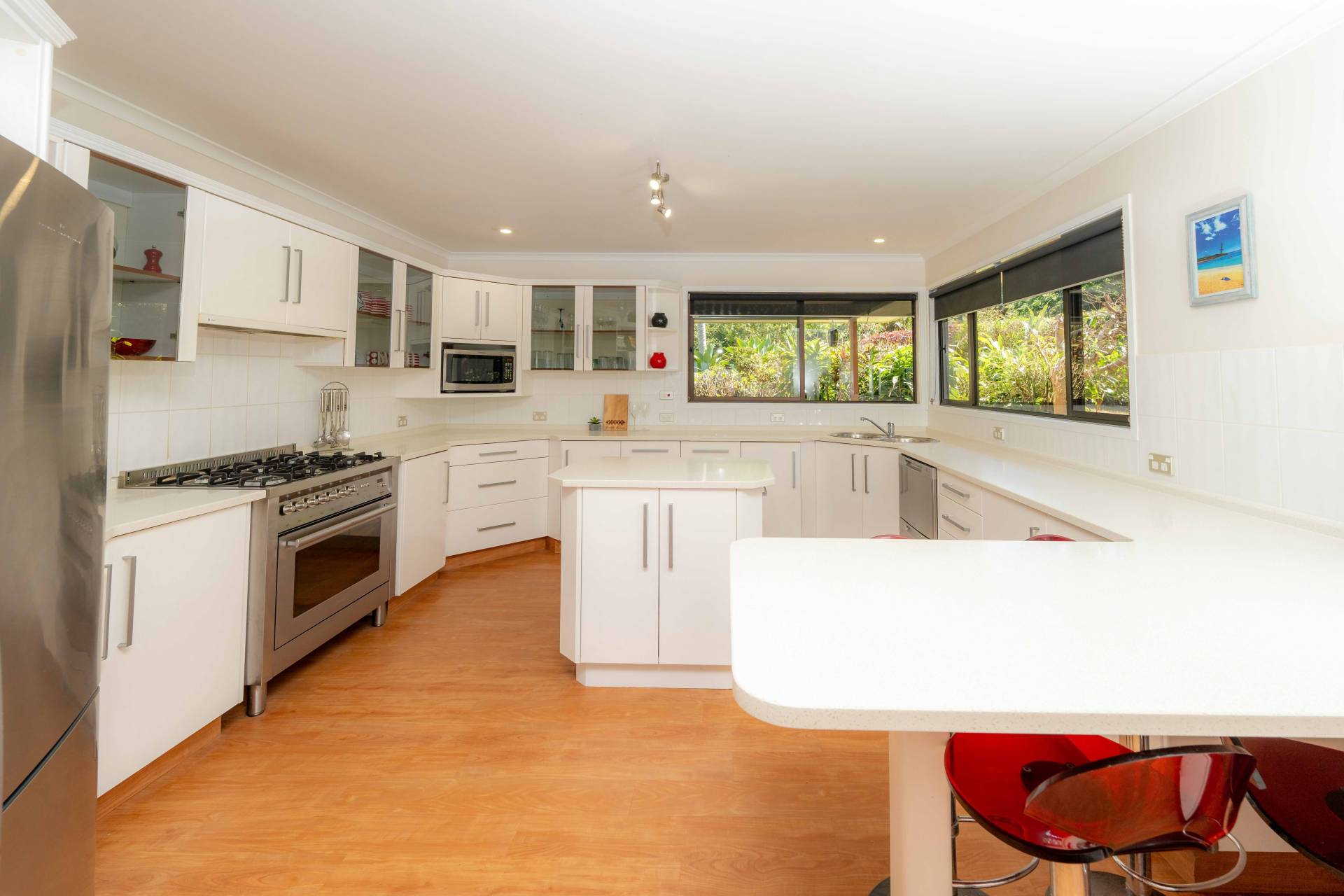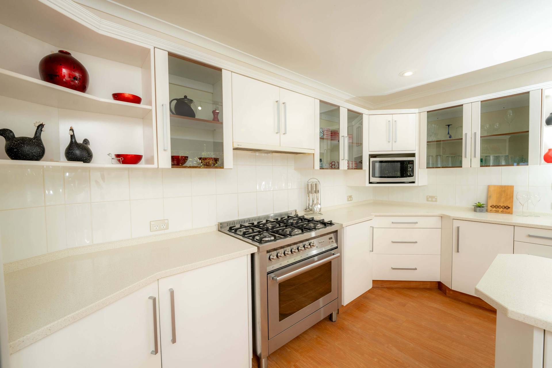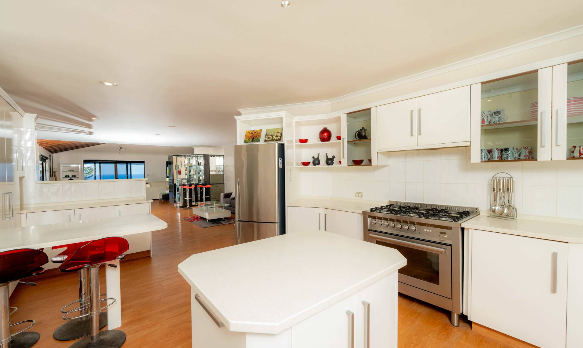 • Stone benchtops, a large island, a pantry, and modern appliances, including a gas oven and dishwasher.