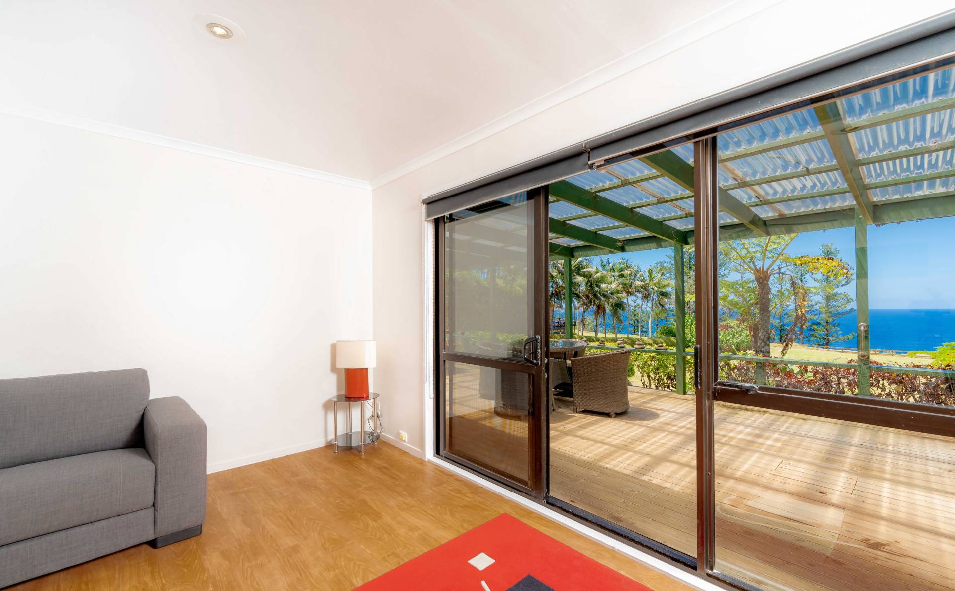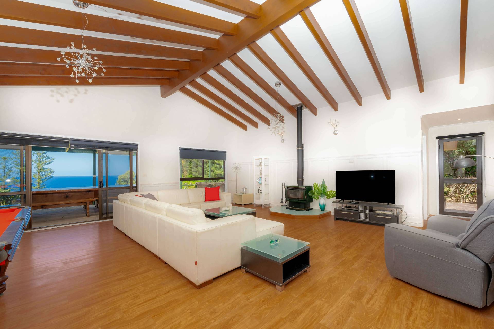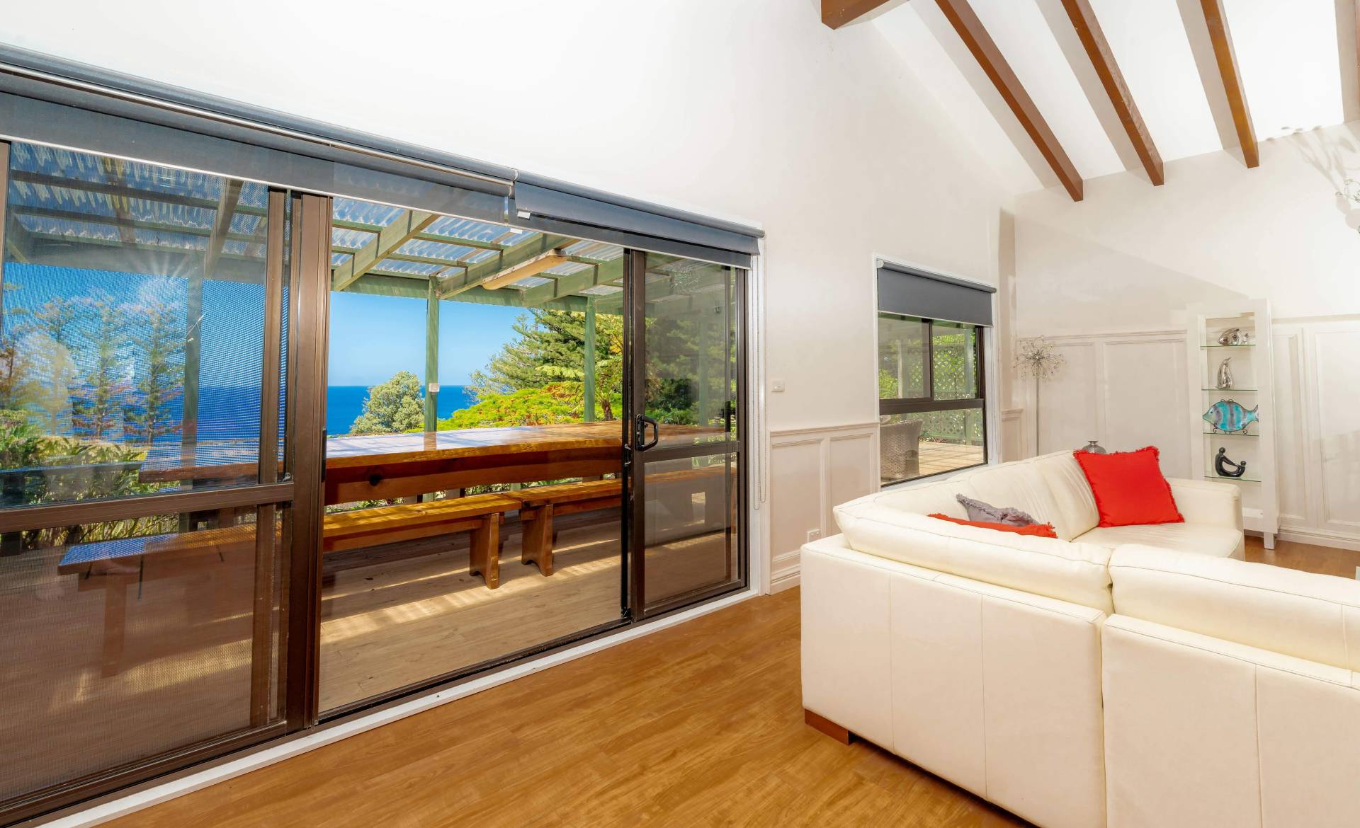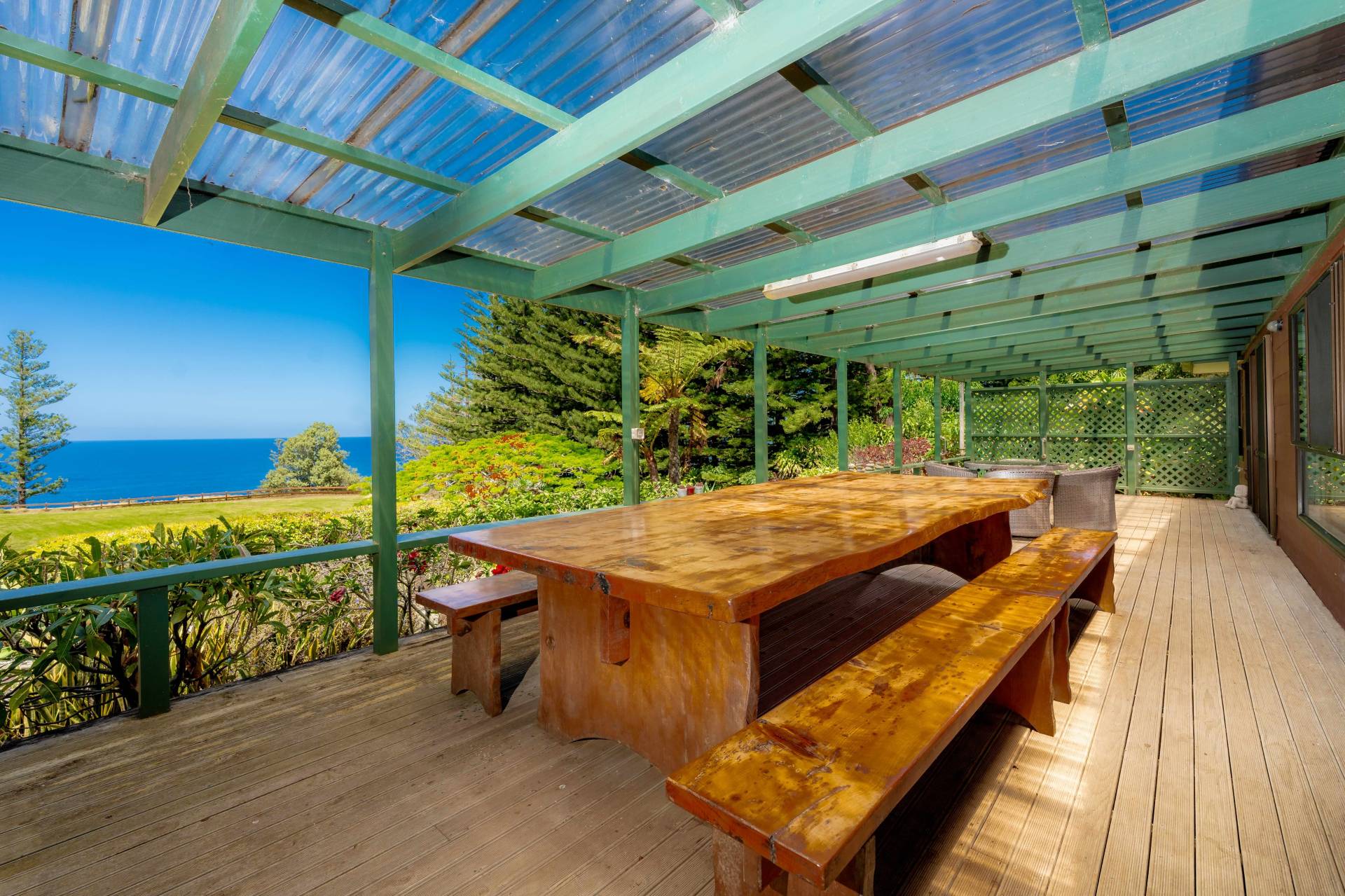 • Verandah: Expansive rear verandah with uninterrupted ocean views, ideal for relaxing or entertaining. The space comes with a large pine slab table and bench seating for memorable gatherings.