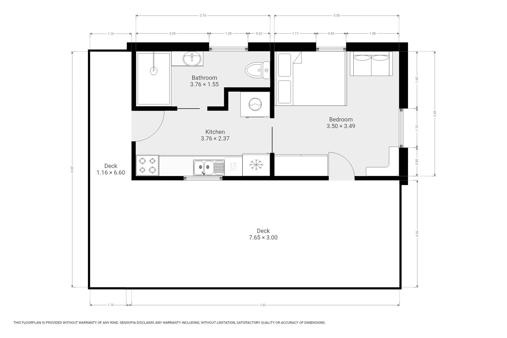 A well-sized studio bedroom and modern bathroom provide all the essentials in a compact, stylish layout.