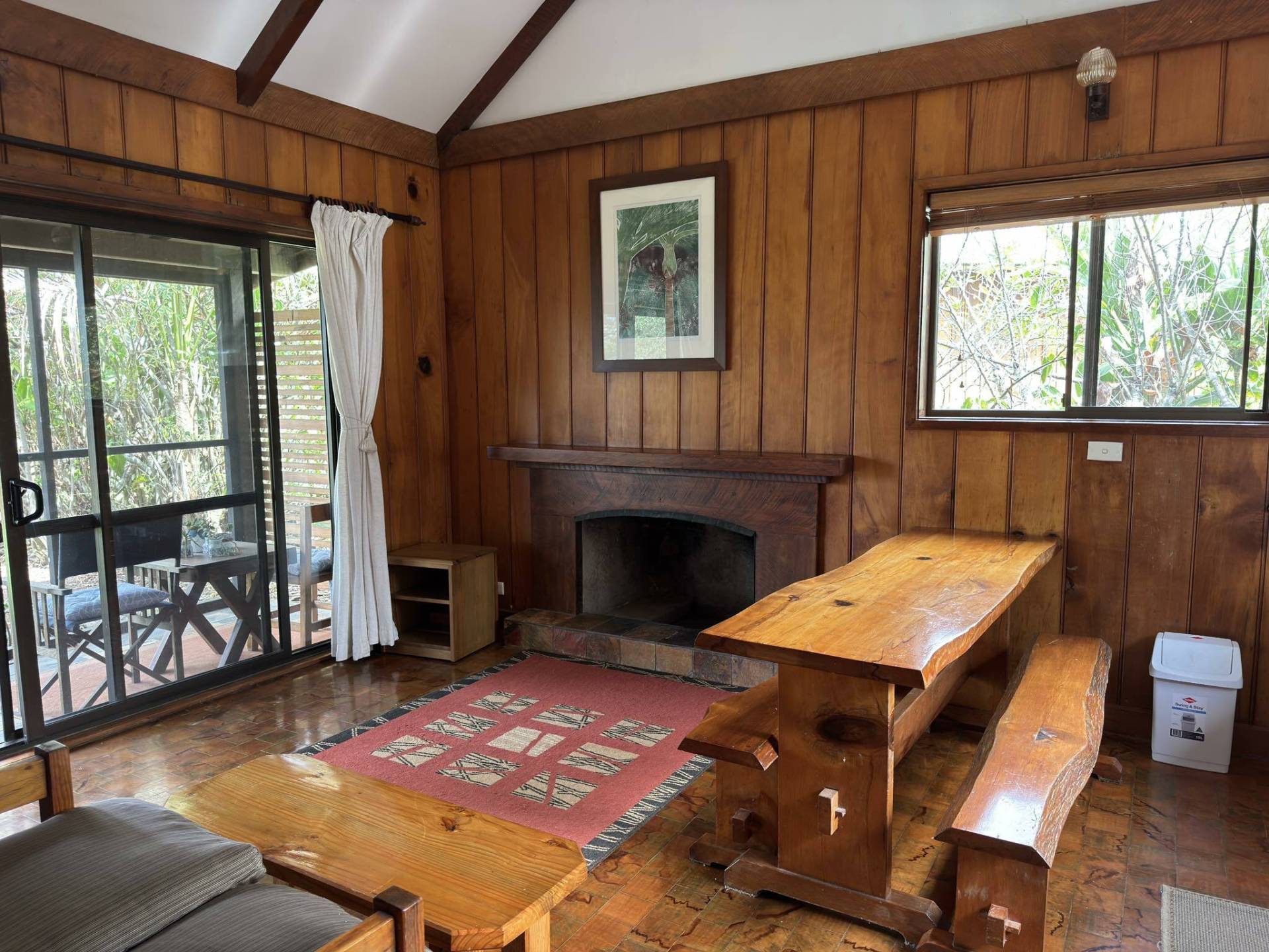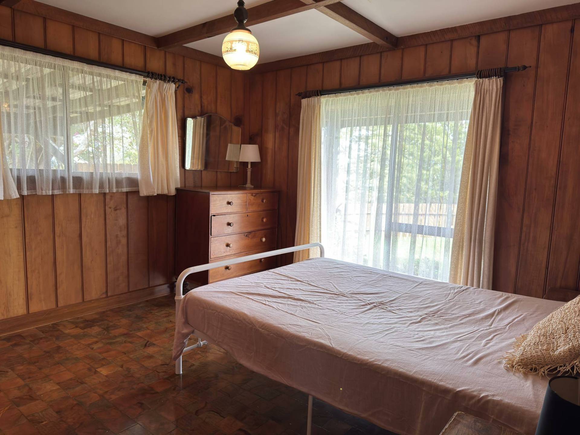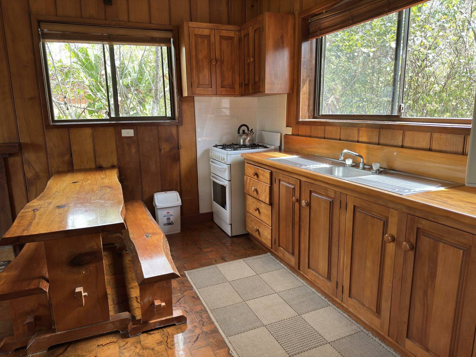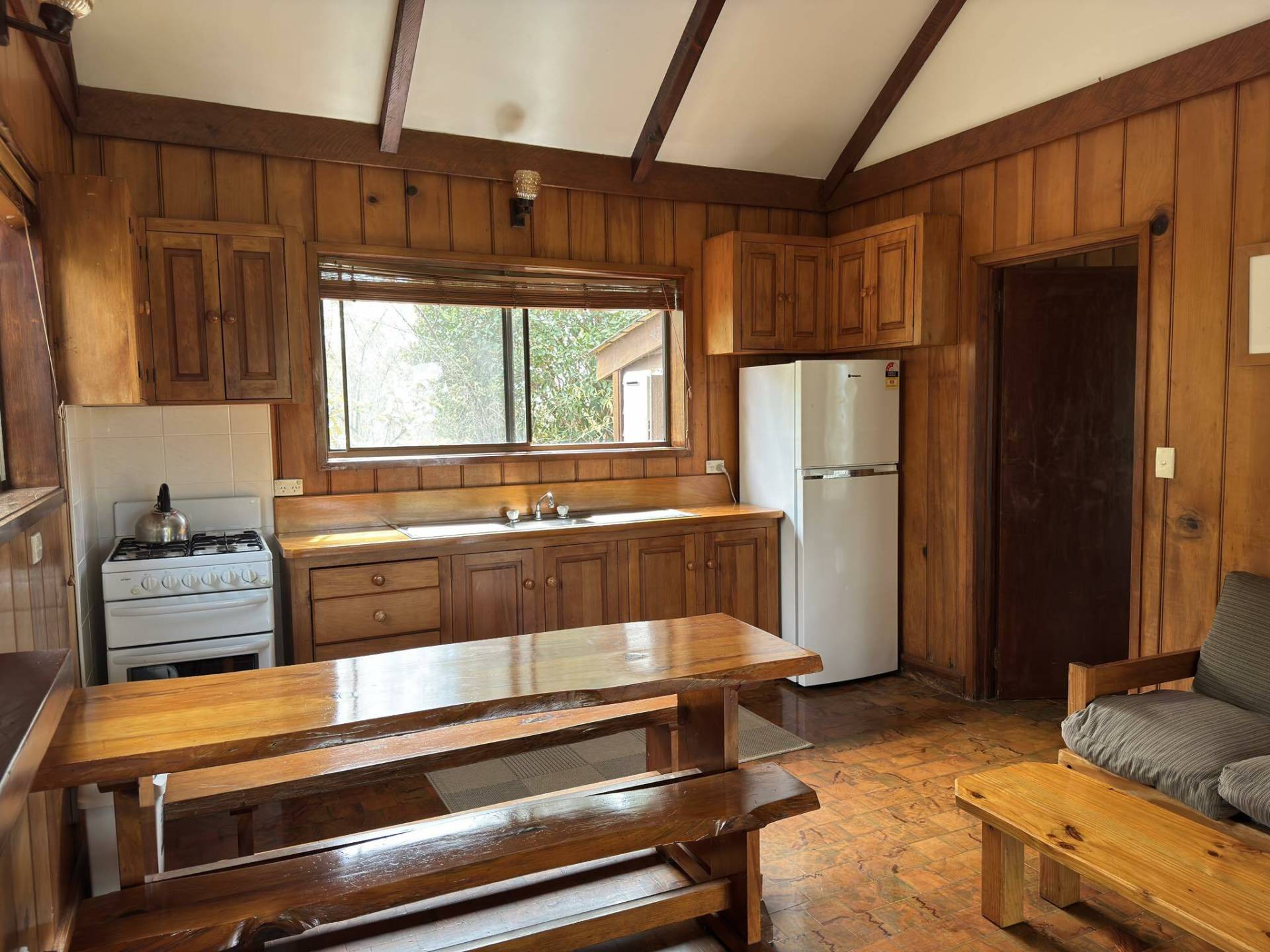 The lounge features beautiful timber parquetry flooring, and the open-plan kitchen is complemented by a rustic pine slab dining table. Enjoy the spaciousness created by cathedral ceilings in the lounge area.