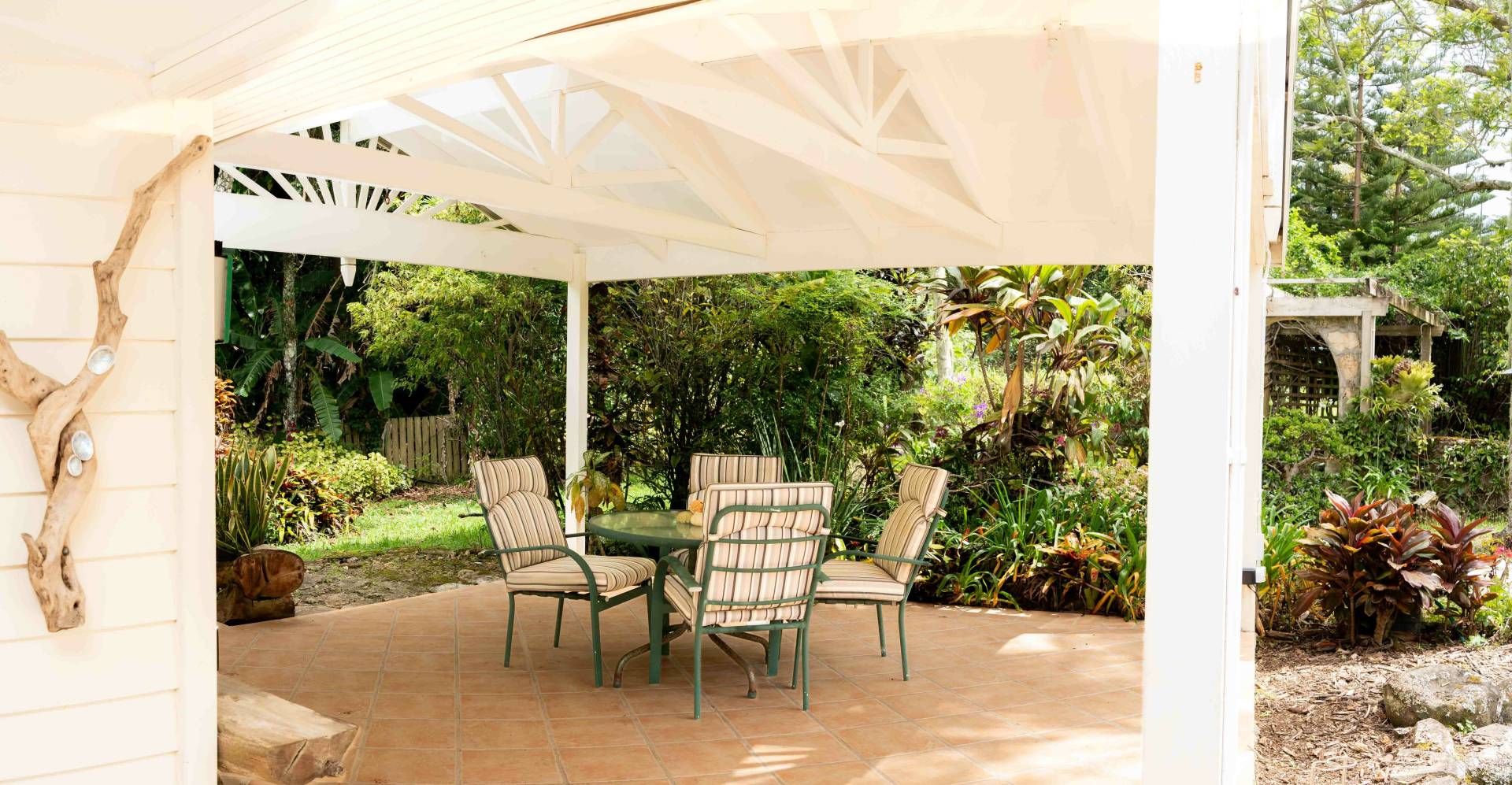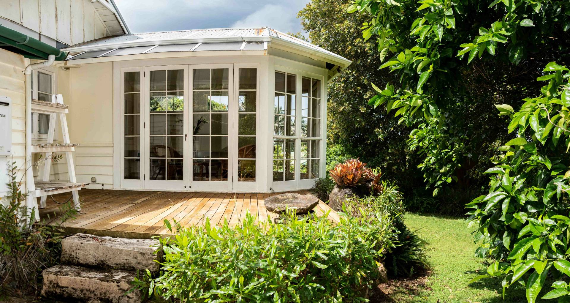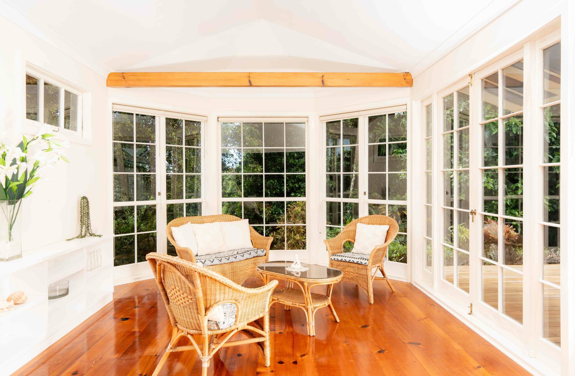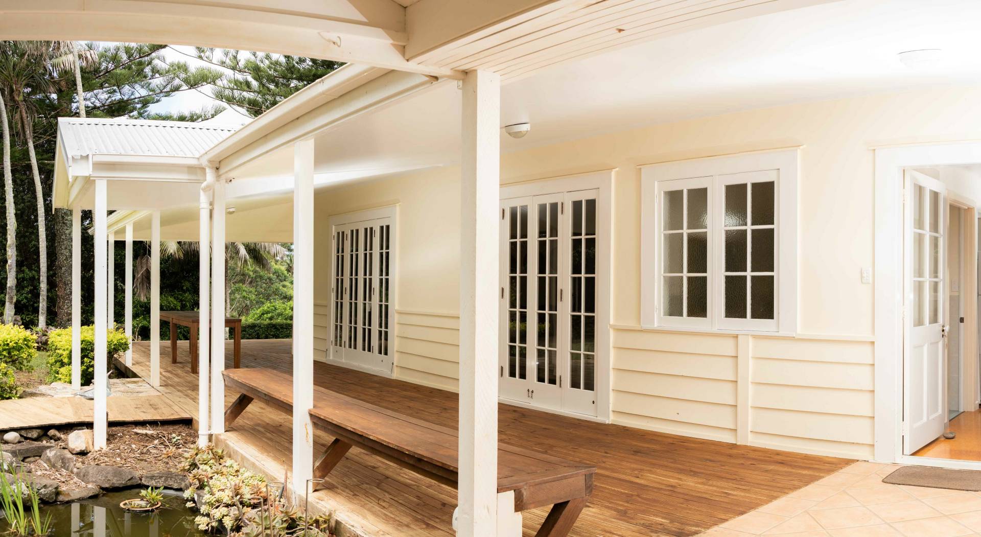 The timber-finished kitchen balances warmth and practicality, offering plenty of storage and bench space for everyday living. Flowing on from the kitchen and living room, a bright atrium-style dining room is filled with natural light and opens onto the wide, wrap-around verandas through classic French doors. These seamless connections between indoors and outdoors make the home ideal for island living, with shaded nooks for summer afternoons and open spaces for gatherings.