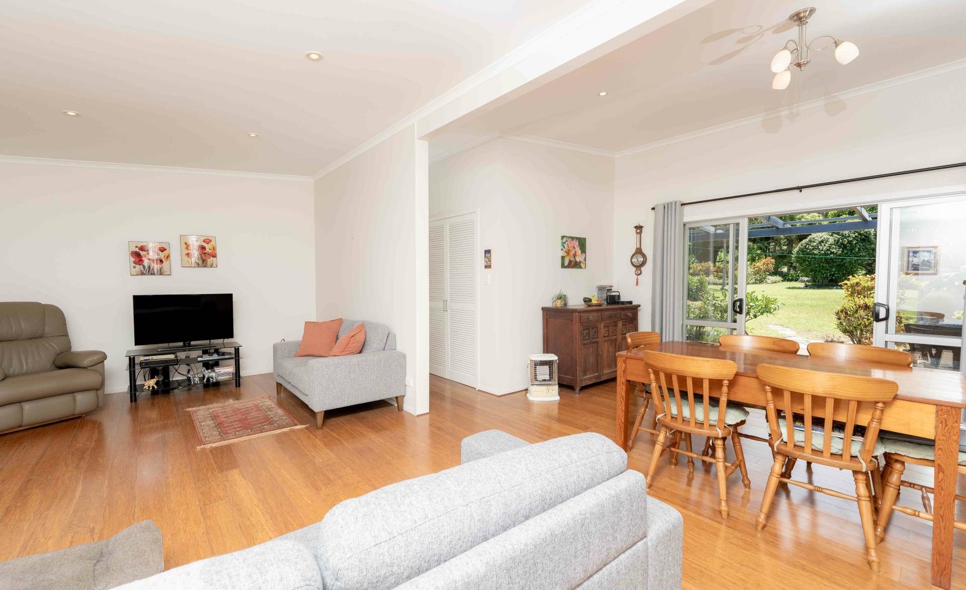 The home features two generous king-sized bedrooms plus a third small bedroom or study, complemented by a modern bathroom with shower over bath, a separate laundry, and the convenience of two toilets – one internal and one external. At its heart is a modern kitchen with adjoining dining area, flowing through to a spacious open-plan lounge with high ceilings that create a light-filled, airy feel. Floating bamboo flooring throughout adds warmth and cohesion to the interior, while the overall presentation is tidy and well maintained.