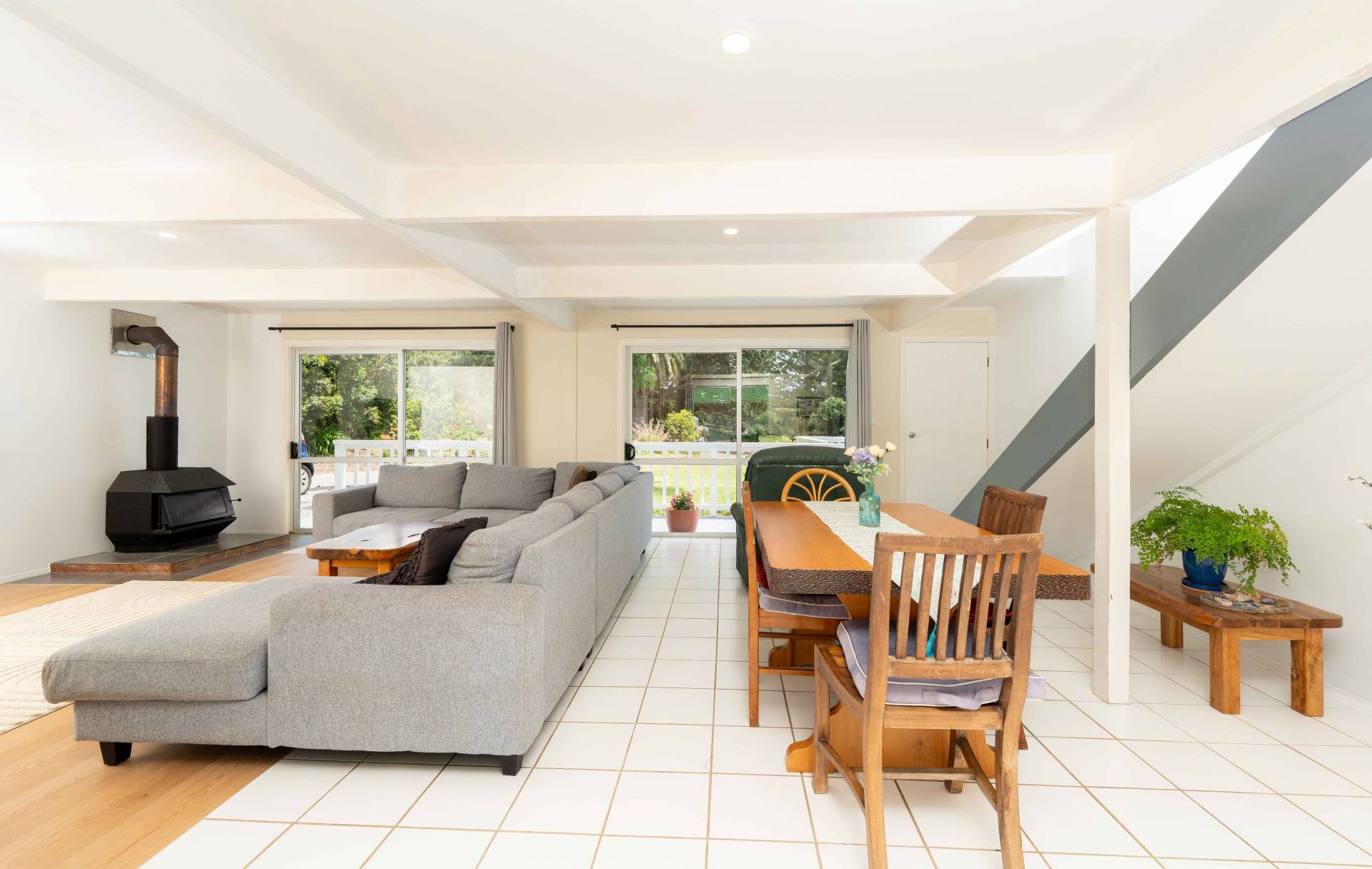 The main dwelling is a distinctive two-level A-frame home designed for comfortable everyday living. The ground floor opens into a large open-plan living, dining and kitchen area, creating a welcoming central hub for family life. A slow-combustion fireplace adds warmth and character to the lounge, while the modern kitchen is well equipped with relatively new whitegoods and practical workspaces. Also on this level are a study, laundry and bathroom, providing excellent functionality.